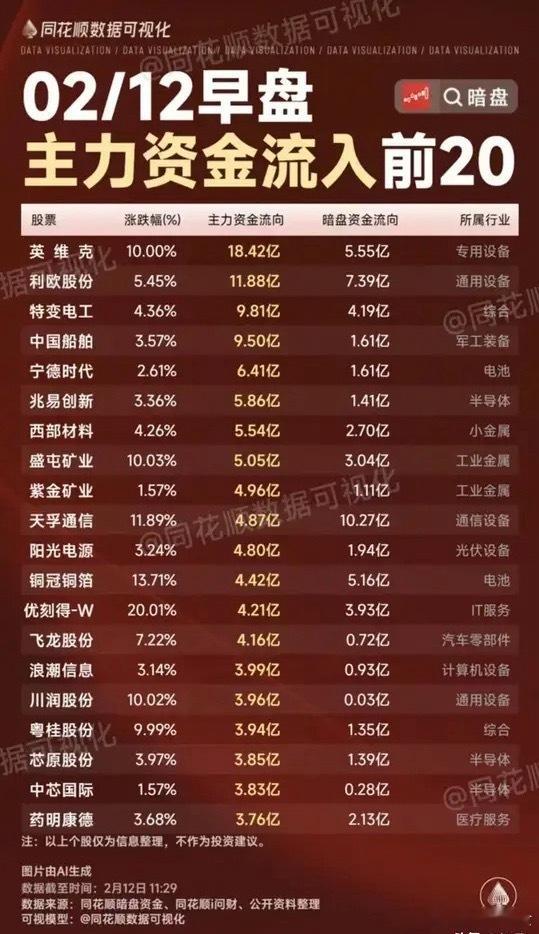 个股梳理分析1. 英维克: 主力流入18.42亿,暗盘流入5.55亿,专用设备行业。AI算力核心标的,早盘资金大幅流入,股价涨停,暗盘同步跟进,市场对其AI业务增长预期强烈。2. 利欧股份:主力流入11.88亿,暗盘流入7.39亿,通用设备行业。布局数字营销与智能制造,早盘主力与暗盘资金显著流入,股价稳步上行,资金对其转型及估值修复抱有期待。3. 特变电工:主力流入9.81亿,暗盘流入4.19亿,综合行业。主营光伏与能源,早盘主力大幅流入,暗盘同步跟进,股价小幅上涨,资金看好其新能源业务扩张及盈利改善。4. 中国船舶:主力流入9.50亿,暗盘流入1.61亿,军工装备行业。受益船舶制造景气,早盘主力大幅流入,暗盘小幅跟进,股价温和上涨,资金对其订单增长及行业复苏预期较强。5. 宁德时代:主力流入6.41亿,暗盘流入1.61亿,电池行业。全球动力电池龙头,早盘主力流入,暗盘同步流入,股价小幅上涨,资金关注其储能业务拓展及海外布局。6. 兆易创新:主力流入5.86亿,暗盘流入1.41亿,半导体行业。存储芯片核心企业,早盘主力与暗盘资金流入,股价小幅上涨,资金看好行业复苏及公司产品迭代能力。7. 西部材料:主力流入5.54亿,暗盘流入2.70亿,小金属行业。主营稀有金属材料,早盘主力与暗盘资金流入明显,股价上涨,资金对其军工及新能源应用拓展抱有期待。8. 盛屯矿业:涨10.03%,主力流入5.05亿,暗盘流入3.04亿,工业金属行业。有色采选冶炼企业,早盘主力流入,暗盘跟进,股价涨停,资金看好金属价格上涨及公司产能释放。9. 紫金矿业:主力流入4.96亿,暗盘流入1.11亿,工业金属行业。全球矿业巨头,早盘主力流入,暗盘小幅流入,股价小幅波动,资金关注其资源扩张及大宗商品价格走势。10. 天孚通信:主力流入4.87亿,暗盘流入10.27亿,通信设备行业。光通信器件龙头,早盘主力与暗盘资金大幅流入,股价大涨,暗盘流入超主力,市场对其AI光模块业务高度认可。11. 阳光电源:主力流入4.80亿,暗盘流入1.94亿,光伏设备行业。光伏逆变器龙头,早盘主力与暗盘资金流入,股价小幅上涨,资金看好其海外拓展及储能业务增长潜力。12. 铜冠铜箔:主力流入4.42亿,暗盘流入5.16亿,电池行业。锂电铜箔核心企业,早盘主力与暗盘资金流入,股价大幅上涨,暗盘流入略超主力,资金对其锂电材料业务增长预期较强。13. 优刻得-W:主力流入4.21亿,暗盘流入3.93亿,IT服务行业。云计算与大数据服务企业,早盘主力与暗盘资金流入,股价20CM涨停,资金关注其AI算力服务布局及转型进展。14. 飞龙股份:主力流入4.16亿,暗盘流入0.72亿,汽车零部件行业。汽车热管理供应商,早盘主力流入,暗盘小幅跟进,股价上涨,资金看好其新能源汽车业务拓展及订单增长。15. 浪潮信息:主力流入3.99亿,暗盘流入0.93亿,计算机设备行业。AI服务器龙头,早盘主力流入,暗盘小幅流入,股价小幅上涨,资金关注其AI服务器出货量及行业地位巩固。16. 川润股份:主力流入3.96亿,暗盘流入0.03亿,通用设备行业。流体机械与能源设备企业,早盘主力大幅流入,暗盘几乎无流入,股价涨停,资金对其新能源业务转型抱有期待。17. 粤桂股份:主力流入3.94亿,暗盘流入1.35亿,综合行业。主营制糖与化工,早盘主力流入,暗盘跟进,股价接近涨停,资金关注其农产品价格波动及业务多元化进展。18. 芯原股份:主力流入3.85亿,暗盘流入1.39亿,半导体行业。半导体IP授权企业,早盘主力与暗盘资金流入,股价小幅上涨,资金看好其在AI芯片领域的IP布局及行业地位提升。19. 中芯国际:主力流入3.83亿,暗盘流入0.28亿,半导体行业。国内晶圆代工龙头,早盘主力流入,暗盘小幅流入,股价小幅波动,资金关注其先进制程突破及国产替代进程。20. 药明康德:主力流入3.76亿,暗盘流入2.13亿,医疗服务行业。CXO龙头企业,早盘主力与暗盘资金流入,股价小幅上涨,资金看好其全球创新药服务业务及产能扩张计划。