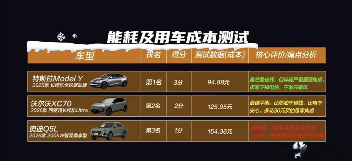 要低成本还是零出行焦虑?沃尔沃全新XC70:都要! 这两天的哈尔滨,依然是零下20℃的极寒气候,沃尔沃全新XC70,全新奥迪Q5L和特斯拉Model Y在这里进行了一场冬季大PK,其中的能耗及用车成本应该是大家最为关心的,毕竟这关乎着大家的钱包和出行焦虑。 这项挑战的总里程为200km,包含了城市道路和高速道路。最终,拿到第一名的是特斯拉Model Y,花费94.88元,但掉电快,还不敢开暖风。全新奥迪Q5L花费154.36元排名第三。而沃尔沃全新XC70花费125.95元排名第二,花费虽然比Model Y多了31元,但可是毫无里程焦虑的,暖风和各种加热功能也是可以大胆放心的使用,妥妥的低成本和零焦虑出行兼得。 探究原因,这就要归功于沃尔沃全新XC70的超混技术,在城市里以纯电驱动为主,到了高速道路上电机会配合发动机,降低油耗的同时还能保证强劲的动力,再回到城市道路依然有足够的电量来纯电行驶。 这就是超混技术的七模全能,可以实现智能无感切换,再配合39.6度的电池包,纯电续航超200km,综合续航超1200km,可以真正实现全场景零焦虑出行,这就是沃尔沃全新XC70低成本和零焦虑出行的“魔力”所在。