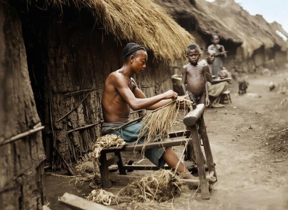 这张照片由美国社会学家、摄影家西德尼·甘博于1917年在四川遂宁县拍摄,一位赤裸上身的中年男子正坐在特制的木架前,全神贯注地编织着草鞋。他的手法娴熟,将稻草搓成绳,再一圈圈地编进鞋底。在那个物资匮乏的年代,草鞋是绝大多数底层民众的主要的鞋类,它经济实惠、透气轻便,穿坏了便随手丢弃,再编一双新的。