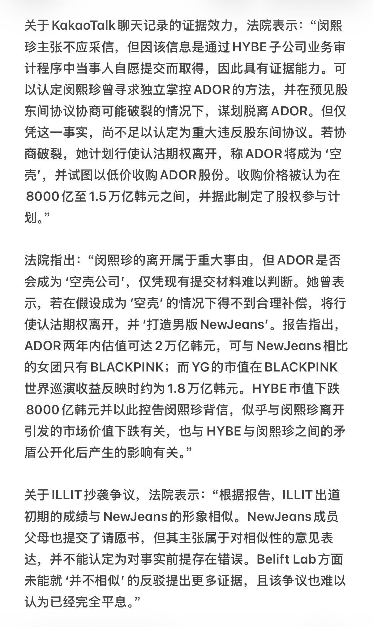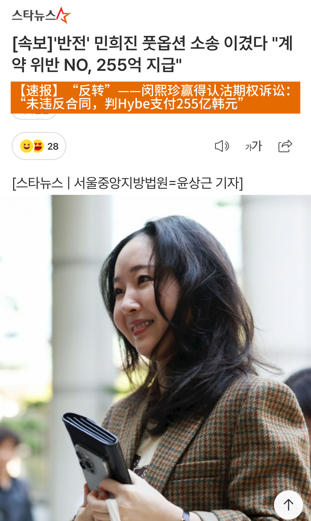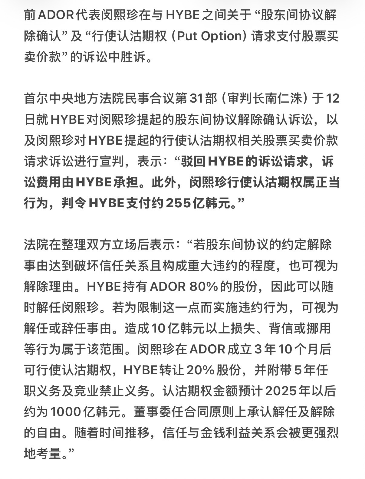 韩媒速报,闵熙珍胜诉,HYBE需向闵熙珍支付255亿韩元。闵熙珍胜诉HYBE需向闵熙珍支付255亿韩元