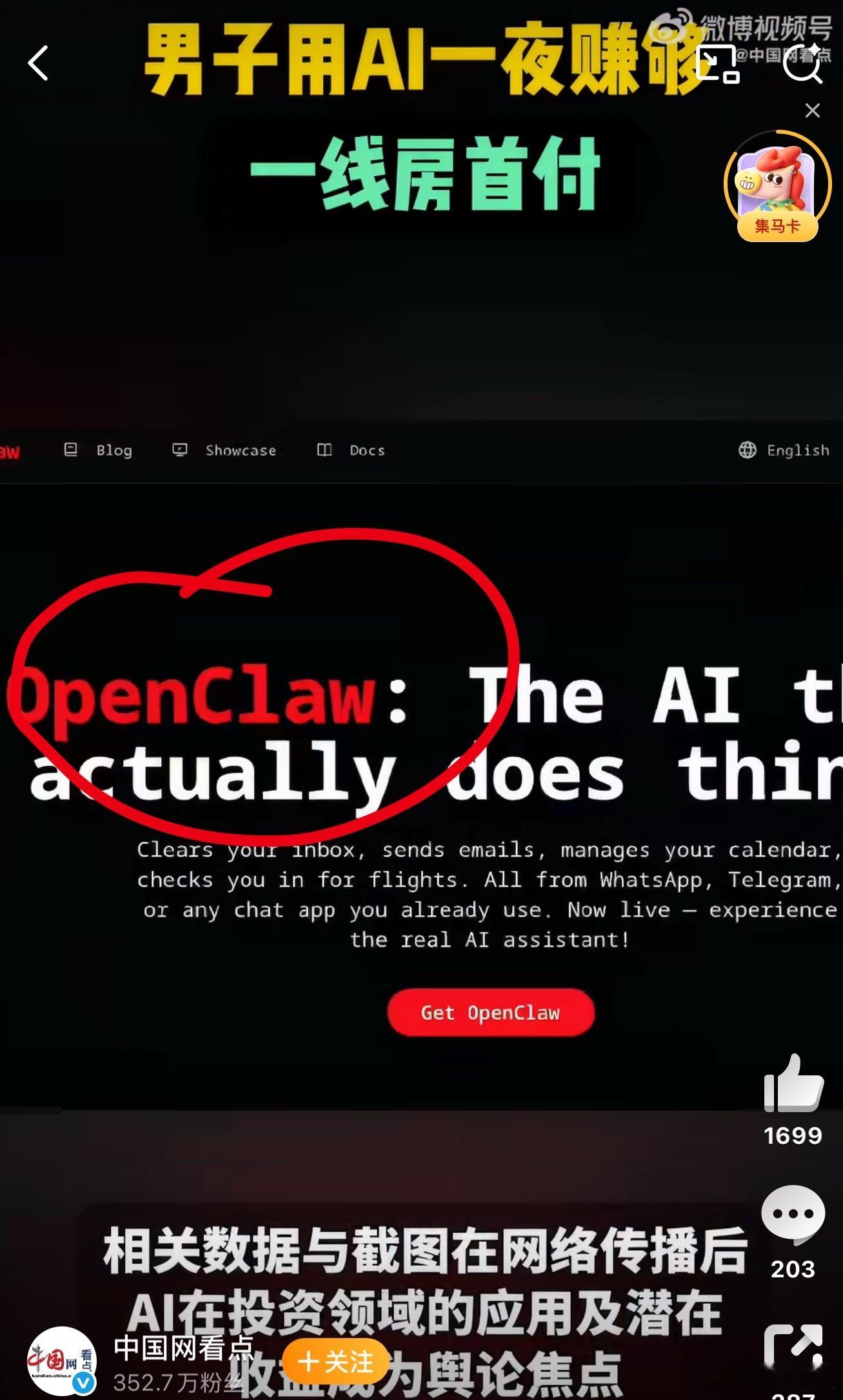 男子用AI一夜赚够一线房首付怎么感觉这是OpenClaw的软广呢?不过模型能力肯定不会差,主要是国产大厂应该多发力搞类似openroute,cursor,openclaw这类拓展大模型能力的工具,别整天想着聚焦什么社交,发红包来吸引用户。