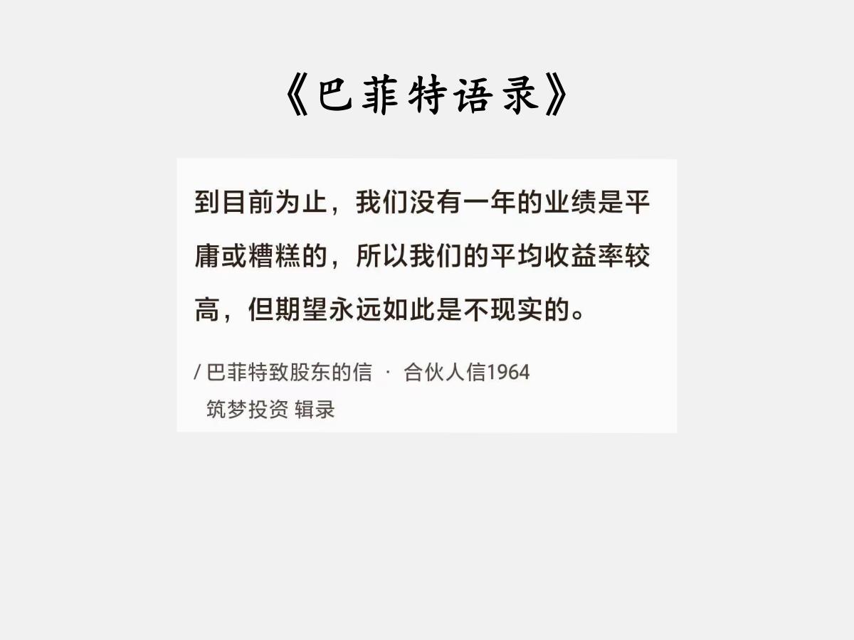 No.167 股神巴菲特谈“永远如此不现实” 巴菲特曰:“到目前为止,我们没有一年的业绩是平庸或糟糕的,所以我们的平均收益率较高,但期望永远如此是不现实的。” 这句话出现于巴菲特1964年写给合伙人的信中。当是时,正是巴菲特合伙基金走过的第八个年头(1957~1964)。 在这八年里,基金收益率最高时达到了45.9%,出现在1961年;最低时也有10.4%,出现在1957年。八年下来的平均收益率更是高达27.7%。 我们都知道,巴菲特的业绩比较标准是道指。他希望长期下来,能够平均每年跑赢道指10个百分点。 而在这八年里,道指平均收益率是11.1%。巴菲特领先了16.6个百分点。不仅达到了目标,而且还是超额完成,远远超过。 更关键的是,这八年的基金收益率年年都领先于道指。最高时领先29%,最低时领先2.4%。 然而,他并没有被如此优秀的成绩冲昏头脑,反而认为“永远如此是不现实的”。 事实也正如他所言,终其一生,他的年化复合收益率在20%左右,大概领先道指13个百分点。 他对投资规律的尊重,能理性地看待投资成绩,客观分析实际情形,值得我们学习。