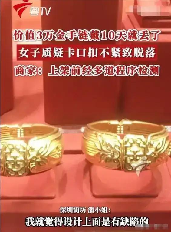 冤不冤!广东深圳,女子花了3万买了一条金项链,她爱不释手,可她才戴了10天,金手链居然丢了,她很心疼,转头就找店家,说这金手链的设计有缺陷,卡口不紧致导致脱落,她才丢了金手链,她要店家给个说法。 深圳一位普通女子,省吃俭用大半年,终于咬牙买下一条金手链。 三万块,不是大风刮来的,是日日攒、月月省,才凑出来的心血。 她自然是爱惜的,做事轻手轻脚,洗澡摘下,睡觉收好,生怕磕碰半分。 可任她如何小心,第十天回家,手腕上空空如也。 链子没了,心也凉了。 她沿着上班的路、回家的梯,来来回回找了无数遍。 地上没有,角落没有,监控里也看不清踪迹。 三万块,就这么凭空消失了。 换做是谁,都要气急,都要心痛,都要找个出口发泄。 她想到了金店,一口咬定,是手链卡扣不紧,是设计有缺陷。 是店家的问题,才让她丢了链子,店家必须全额赔偿。 这话听着解气,可细想下去,却少了几分道理。 店家拿出同款手链当场测试,卡扣开合正常,闭合紧实。 出厂有质检,标准有依据,拿不出证据,便不能凭空扣上“不合格”的帽子。 店家愿意帮忙查监控,愿意配合寻找,却不肯为丢失买单。 这不是冷漠,是守住最基本的权责边界。 调解人员说得明白,首饰佩戴与保管,本就是佩戴者自己的责任。 外力拉扯、动作幅度、日常松动,都属于使用中的风险。 不能因为东西丢了,就把责任一股脑推给商家。 现实里,总有这样的人。 东西丢了,怪路不平;物品坏了,怪商家不结实;自己疏忽,反倒要别人负责。 情绪上来时,道理便被抛在脑后。 可维权这东西,从来不是比谁更委屈,比谁声音更大。 它讲的是事实,是证据,是公平。 店家只对产品质量负责,不对人的疏忽兜底。 这是常识,也是规矩。 女子的委屈是真的,心痛是真的,三万块的损失也实实在在。 但委屈不等于占理,心痛不等于可以随意追责。 成年人的世界,本就该为自己的财物多一分留心。 贵重首饰戴在身上,时常检查卡扣,留意松紧,本就是应有的谨慎。 丢了东西,最该做的是吸取教训,而不是硬找他人垫背。 合理维权,人人支持;无理索赔,终究站不住脚。 心疼她的损失,却不认同她的做法。 这世间的公平,从来都不是偏向弱者,而是偏向讲理的人。 三万块买个教训,虽沉重,却也清醒。 以后再戴贵重物件,多一分小心,便少一分遗憾。 各位,这件事你们怎么看? 评论区说说你的想法。