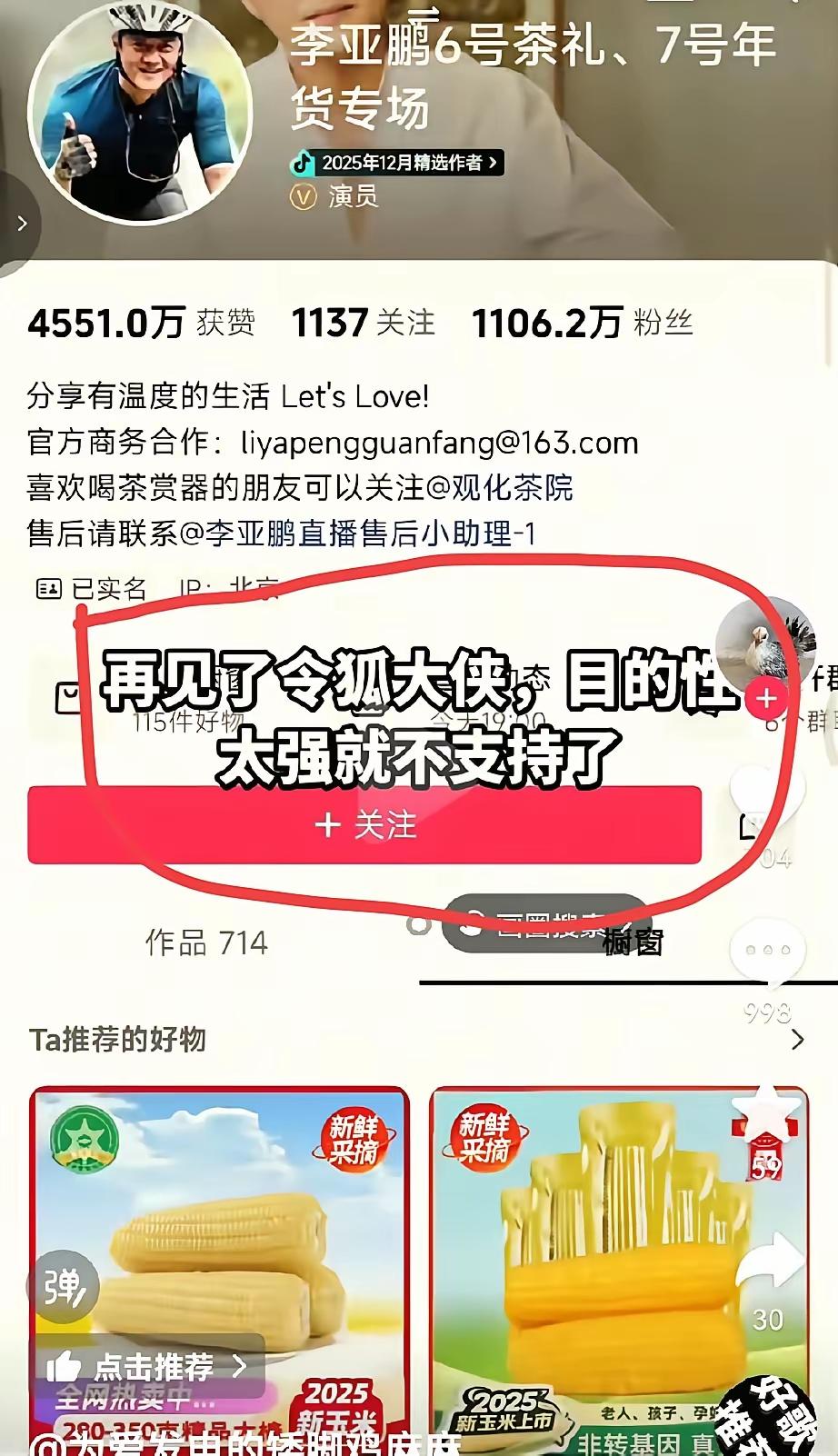 你要说绝对崇拜一个人,这世上是没有值得你那么做的。他有优点就必然优缺点。前几日。把李亚鹏捧上天,这几天陆续就有人开始取关了。图片就是。 啥叫目的,卖六十万只鸡,能挣多少钱。你要是能卖出去,也会有人买,还检测合格的鸡,你卖不卖? 也许你问李亚鹏,他过许不会卖,但你问李亚鹏之外的任何人,他九成九九九九的,他都能卖。 他卖了鸡,也卖了其他商品,他又捐了款,他能不能给自己赚口碑,加分,在很多人眼里,是能的。 有人说他是无量仙翁。那个电影,我看的虎头蛇尾,所以,一直以来,无量仙翁都是个正面人物,到最后,也没从我心里抹去。就是看着那个小老头,挺好玩的。 说什么对错,谈什么是非,如果我能赚钱那么容易,我比他还过分。