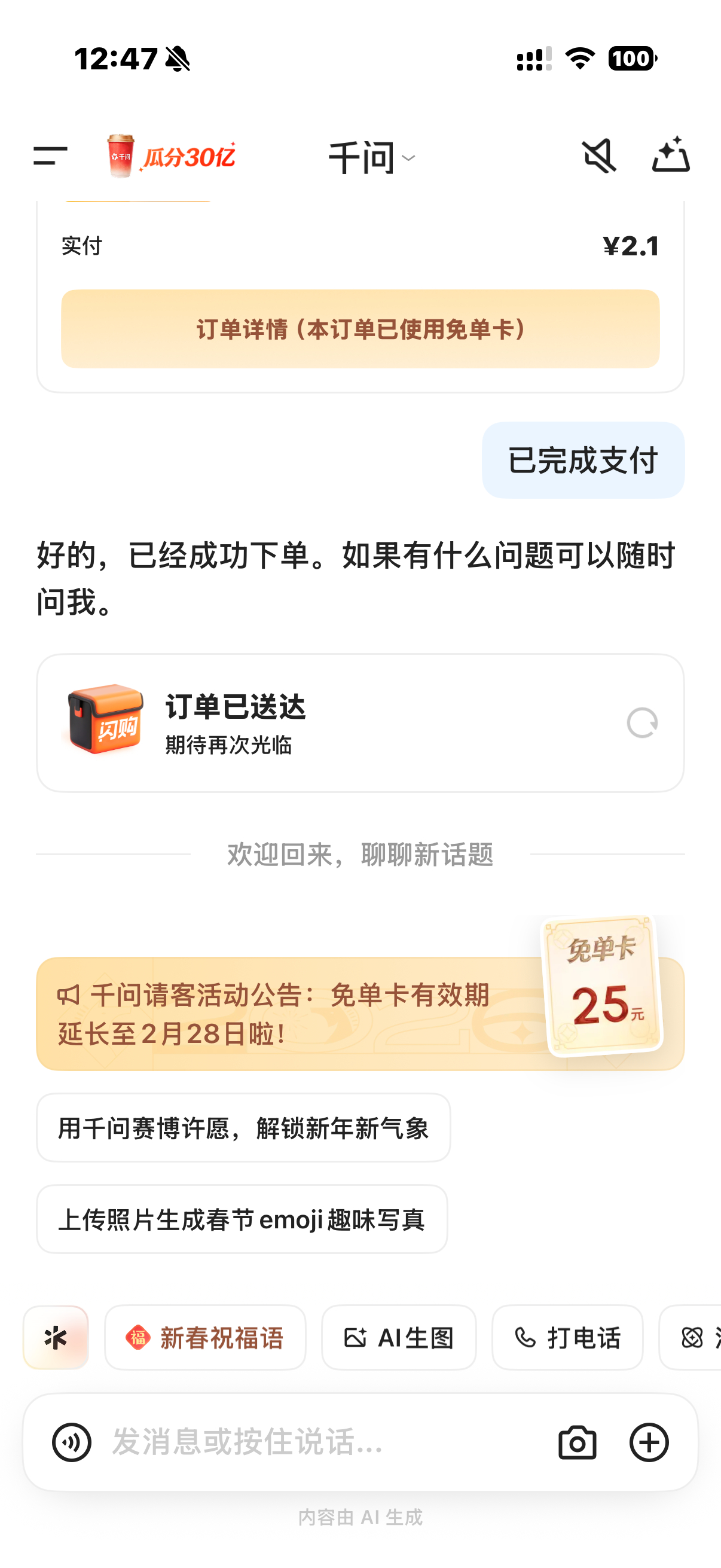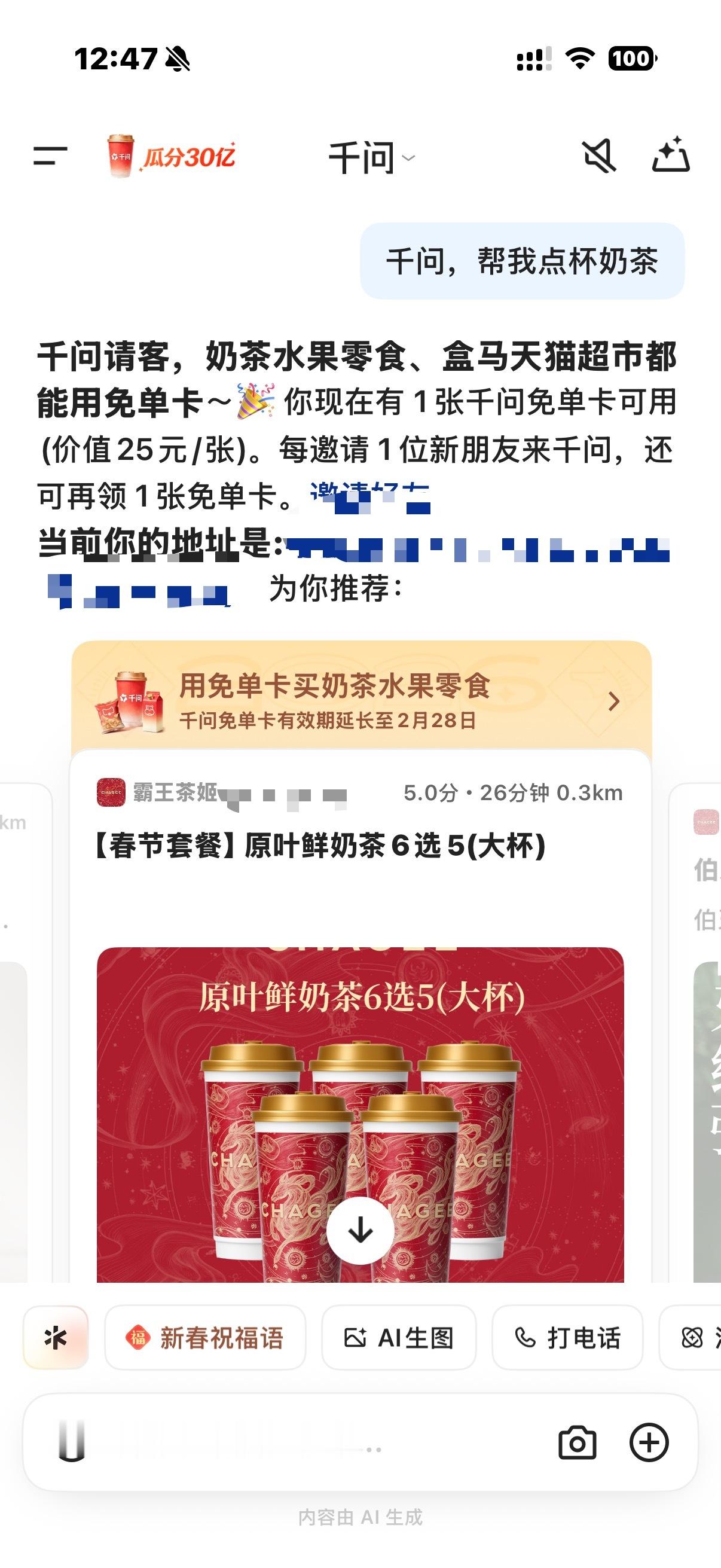 千问说买得开心过两天见 前段时间身边朋友一直在给我分享千问的链接,一开始我还嫌烦(好多人发)亲测后直接真香警告。要想免费喝奶茶,你不需要做其他的。只需打开千问,这样你就得到了第一杯奶茶...