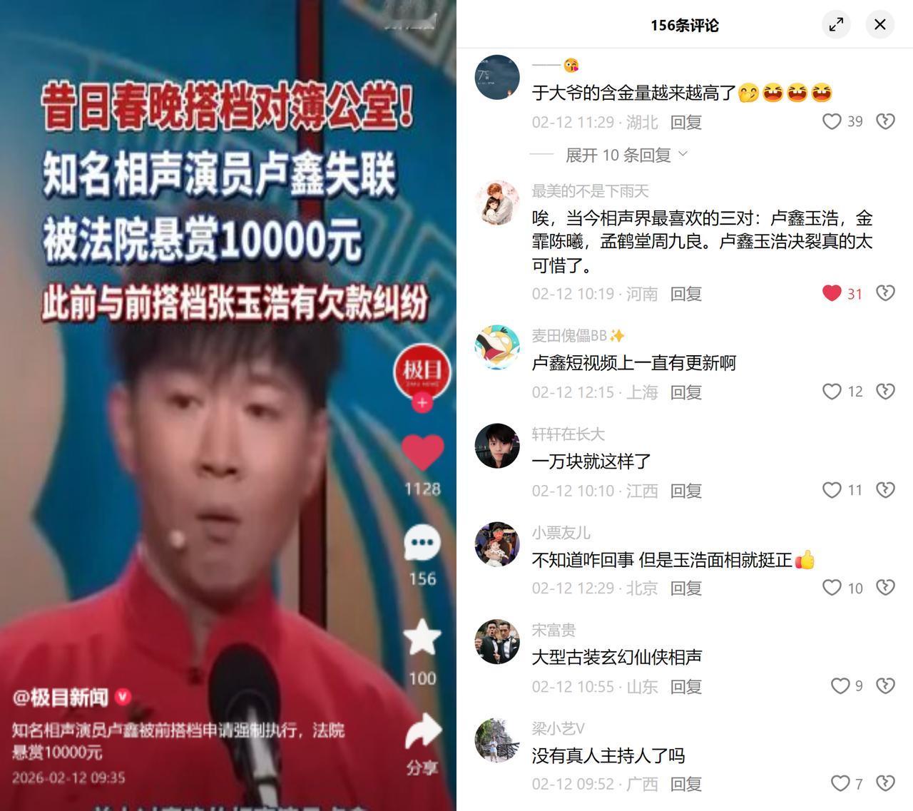 卢鑫玉浩反目,官方悬赏1万寻卢鑫 当年他俩靠《笑傲江湖》夺冠爆火,紧接着成立相声社团,还上过春晚,前途本来亮堂堂的。 结果最后居然因为财务撕破脸,卢鑫挪用公司资金还个人贷款,私自办公司贷款转嫁风险,连张玉浩的劳务费和分红都拖欠着。 现在卢鑫被官方强制执行,还被定为失联,可大家说,明明最近还刷到他直播呢。 说真的,这事看着是相声搭档决裂,本质就是小团队创业的典型悲剧啊! 哪个兄弟合伙创业不是先讲感情后讲规则?账面上稀里糊涂,全靠咱们谁跟谁撑着。 可信任能当饭吃吗?等钱的矛盾一摆上台面,当初的默契瞬间碎得稀碎的! 再说这1万的悬赏金,对应着20万的执行标的,怎么看都有点讽刺。 更离谱的是,官方说他失联,大家却能刷到他直播,这操作也太魔幻了吧? 多少曾经的黄金搭档,最后都栽在用感情代替制度这事儿上。 讲真,不管是合伙还是搭班子,先把规则掰扯清楚,比啥兄弟情都经造!