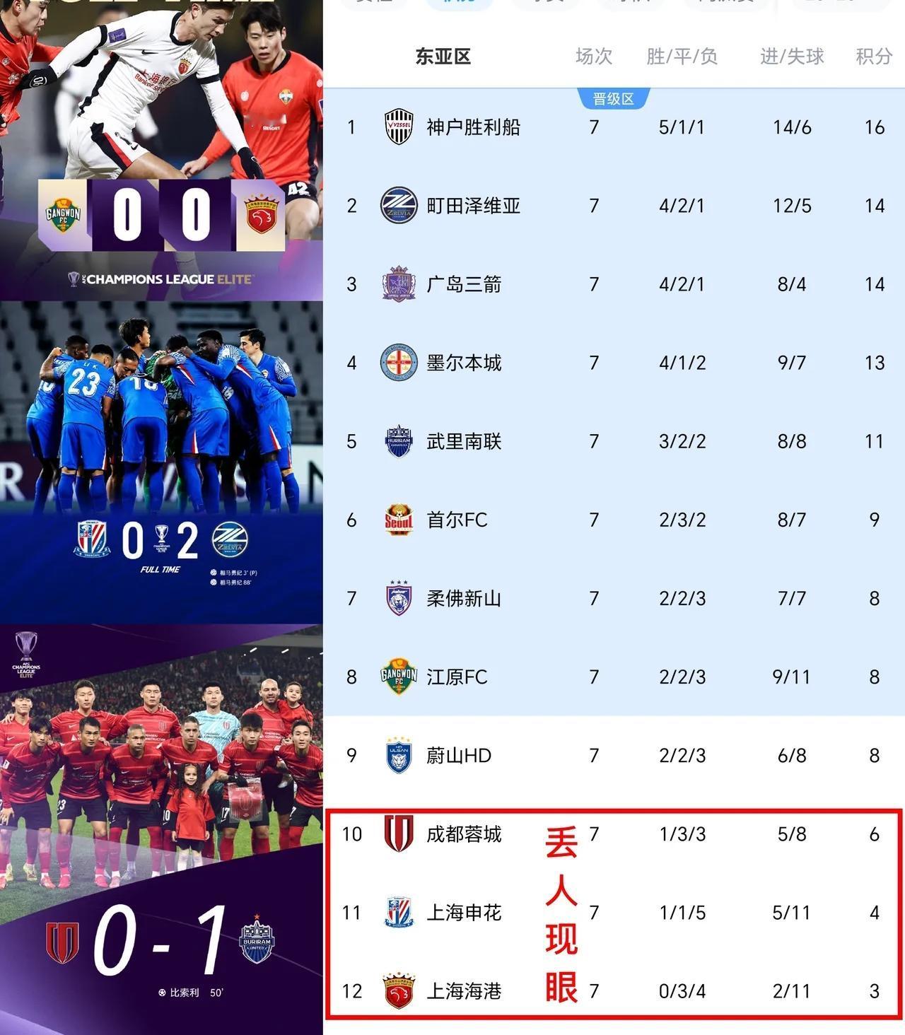 中超三强在亚冠的排名正好和中超联赛相反,中超冠军在亚冠排名垫底,这是怎么回事……? 中超联赛排名是1-上海海港,2-上海申花,3-成都蓉城,但是到了亚冠赛场倒数第1是上海海港,倒数第2是上海申花,倒数第3是成都蓉城,而且到目前为止,上海双雄已经彻底失去了亚冠8强资格,仅有成都蓉城还保留了一丝希望,最后一轮对阵排名第2的汀田泽维亚必须取胜,积分9分,才能挽回一丝中超颜面,不过难度很大,不出意外,中超三强今年在亚冠赛场算是遭遇“滑铁卢”了! 上海海港贵为中超联赛冠军,在亚冠赛场一场未胜,7场比赛3平4负,打进2球丢了11球,场均进球0.3球,要知道海港在中超联赛可是场均3球的存在,为何到了亚冠赛场反差如此巨大,这其中的原因有谁知道……? 上海申花作为中超联赛最具底蕴的豪门球队,也是中超联赛冠军最强竞争者,亚冠赛场7战取得1胜1平5负的战绩,打进5球丢了11球,积分4分,已经彻底失去晋级资格,申花在中超联赛所向披靡,打法极具侵略性,为何在亚冠赛场就是任人拿捏的“软柿子”,为何在亚冠赛场踢不出中超水平,有谁知道……? 成都蓉城作为中超新贵,也是亚冠新军,第一次参加亚冠比赛,取得成绩却是中超球队最好的,7场比赛1胜3平3负,打进5球丢了8球,积分6分,蓉城还有一丝晋级机会!成都蓉城虽然进球也不多,但是防守确实是中超最好的,因为丢球比海港,申花都要少,这种实力在中超联赛已经得到了验证! 中超三强,亚冠倒数,中超冠军,亚冠垫底,中国足球何日才能出头……?上海海港 上海申花 成都蓉城