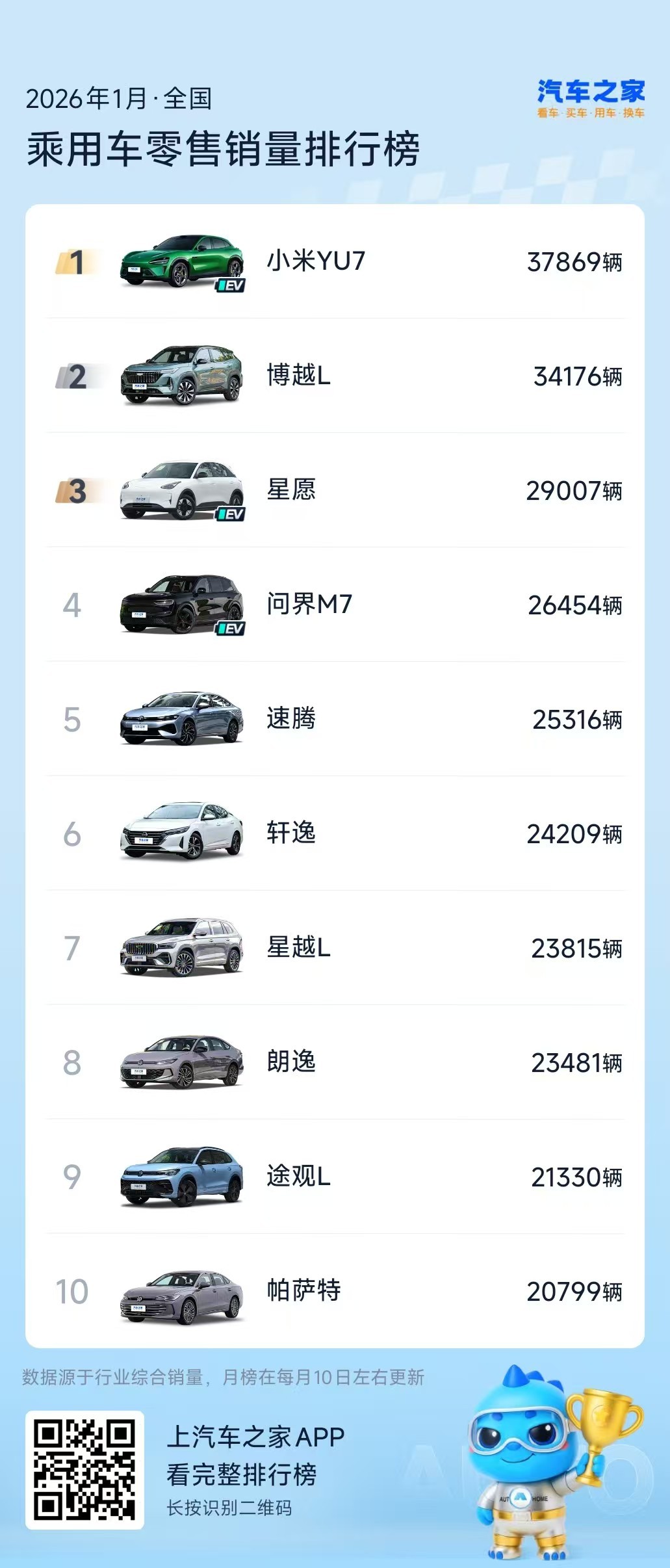 汽车之家 1 月单车型销量榜:小米 YU7 排名第一。