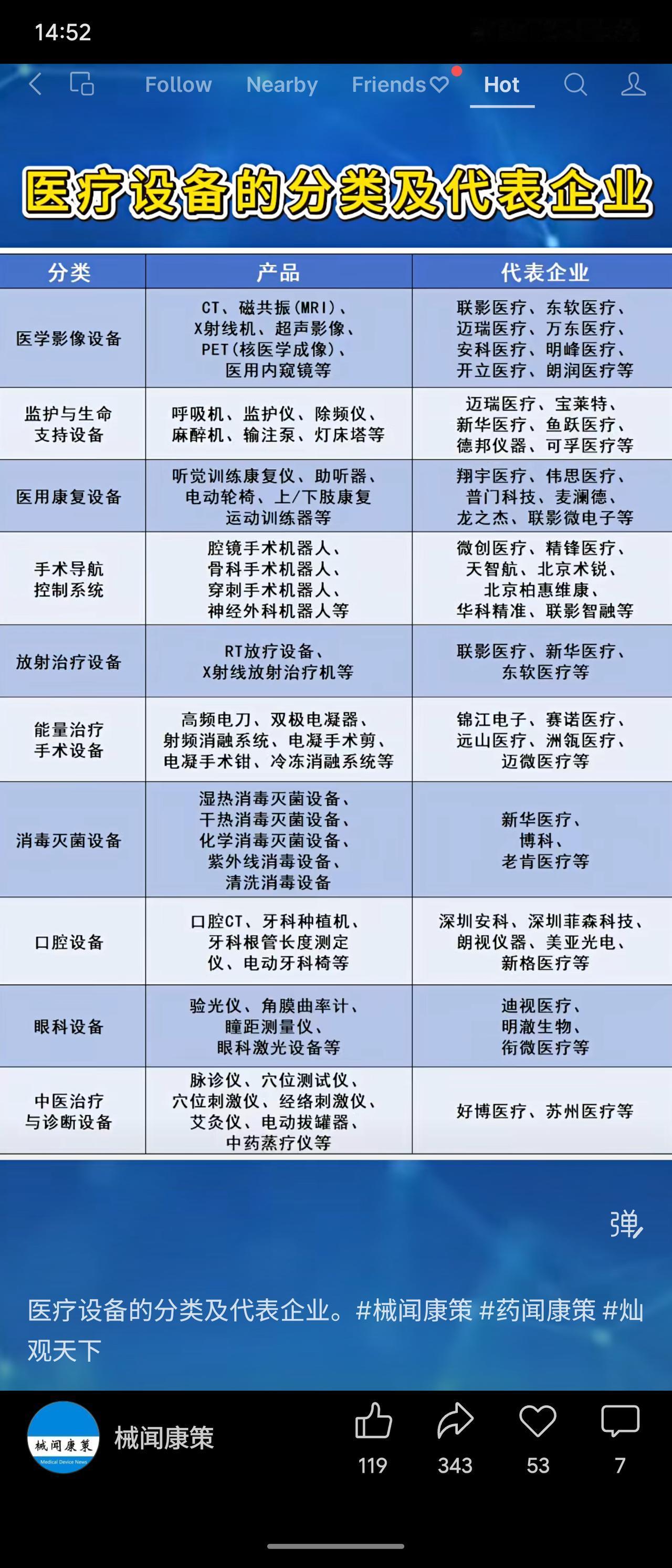 梳理医疗设备分类与代表企业:医学影像(联影、迈瑞)、监护支持(新华、鱼跃)、康复设备(翔宇)、手术机器人(微创、天智航)、放射治疗(联影)、能量手术(锦江)、消毒灭菌(新华)、口腔(美亚光电)、眼科及中医设备等,展现国内产业布局。