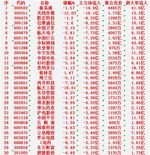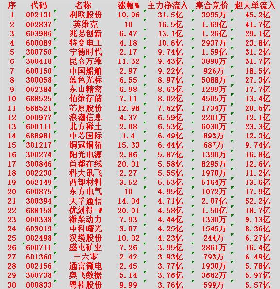 2月12日收盘,主力资金,已经大幅卖出的30名单: 新易盛:净流出 14.4亿元 光线传媒:净流出 10.1亿元 胜宏科技:净流出 8.33亿元 信维通信:净流出 8.25亿元 中国卫星:净流出 7.92亿元 航天电子:净流出 7.72亿元 中国巨石:净流出 7.29亿元 中际旭创:净流出 7.26亿元 农业银行:净流出 6.84亿元 中文在线:净流出 6.58亿元 2月12日收盘,主力资金“大幅买入”的30名单: 利欧股份:净流入 31.5亿元 英维克:净流入 16.5亿元 兆易创新:净流入 13.1亿元 特变电工:净流入 10.6亿元 宁德时代:净流入 9.74亿元 昆仑万维:净流入 9.43亿元 中国船舶:净流入 9.22亿元 蓝色光标:净流入 8.97亿元 东山精密:净流入 8.63亿元 佰维存储:净流入 8.02亿元 芯原股份:净流入 7.62亿元 浪潮信息:净流入 6.59亿元 北方稀土:净流入 6.53亿元 中芯国际:净流入 6.49亿元 铜冠铜箔:净流入 6.44亿元 阳光电源:净流入 5.87亿元 首都在线:净流入 5.58亿元 科大讯飞:净流入 5.55亿元 西部材料:净流入 5.53亿元 东方电气:净流入 4.95亿元