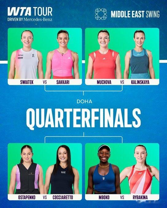 今晚预告WTA1000多哈1/4决赛20:00,奥斯塔彭科vs科西亚雷托(0-1)21:30,斯瓦泰克vs萨卡里(4-3)23:00,莱巴金娜vs姆博科(2-1)00:30,穆霍娃vs卡琳斯卡娅(3-0)你心中的半决赛阵容是:奥胖vs莱巴金娜斯瓦vs穆霍娃是这样吗?网坛风云