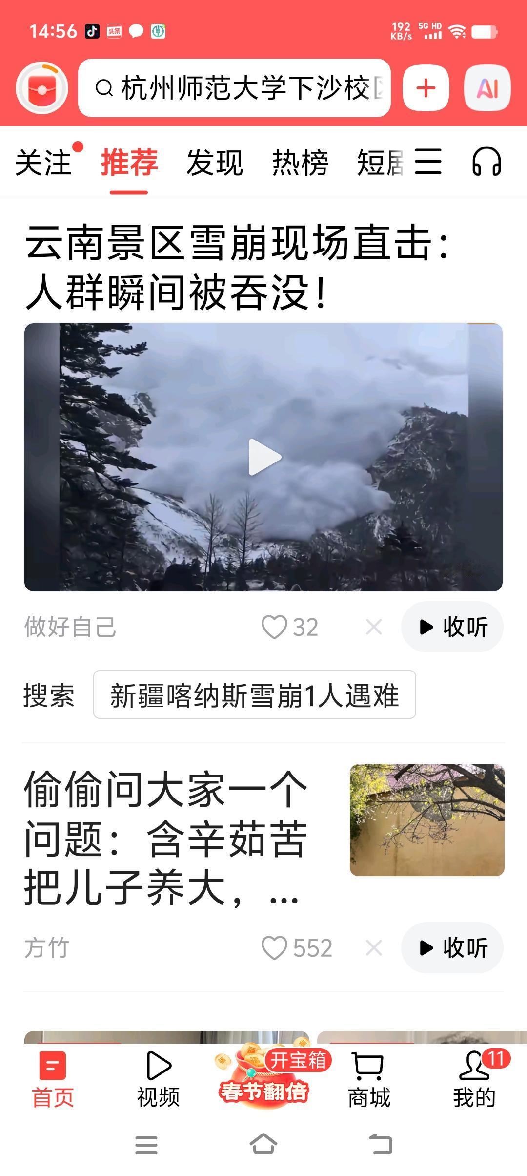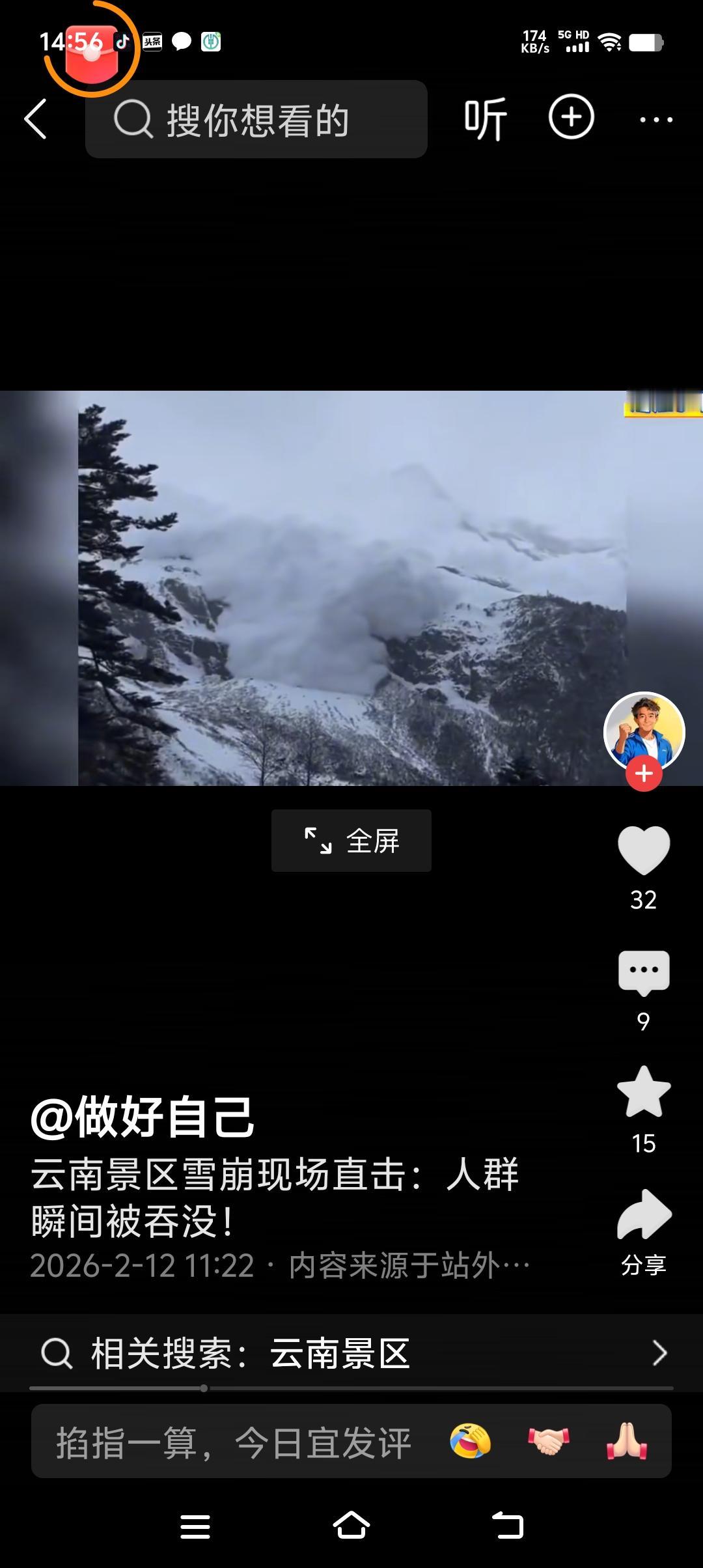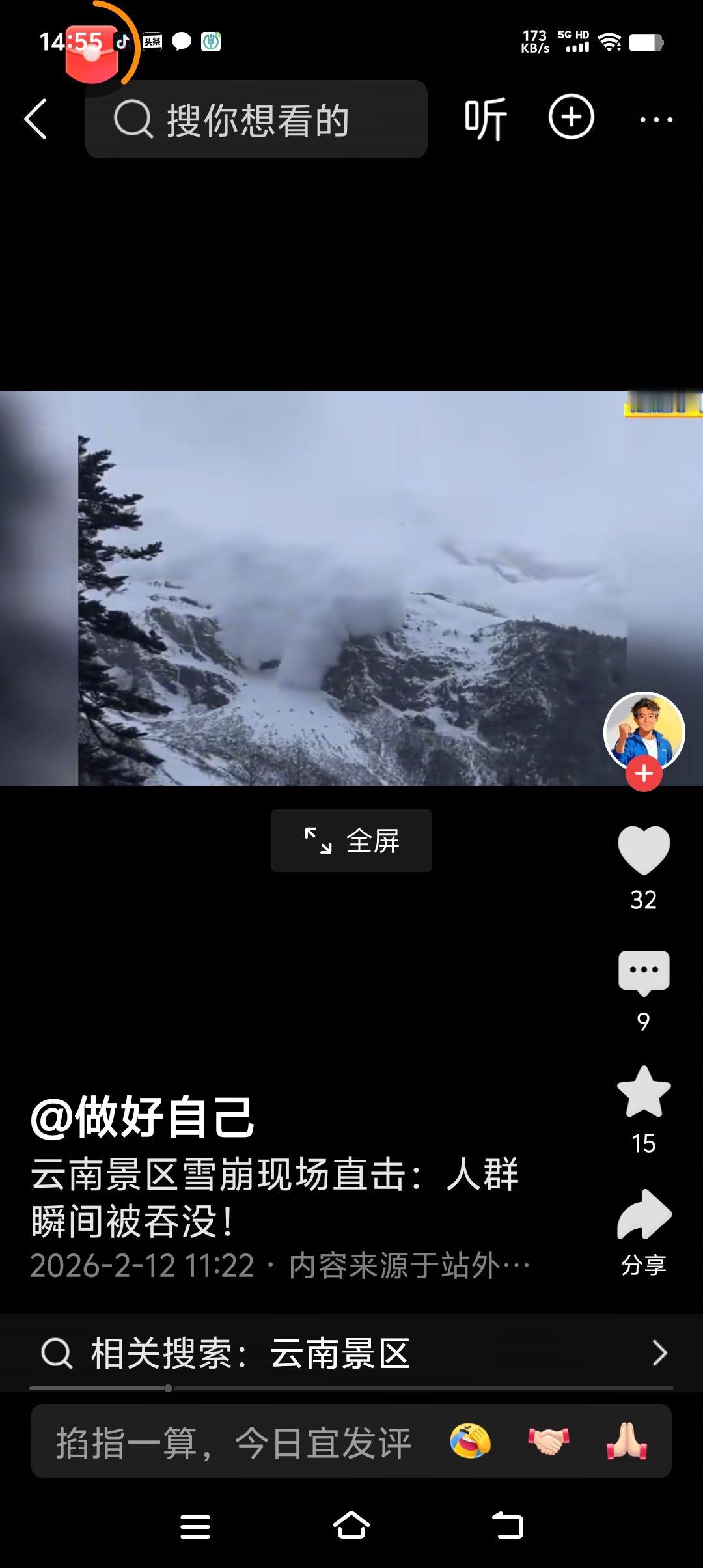 2026年2月12日 云南景区雪崩现场惊心动魄! 一群游客拍摄者眼看着雪像一团白色烟雾一样,一点点散开,离他们越来越近, 当游客们觉得他们很安全的时候,瞬间雪崩来临霹雳啪啦的雪当头落下来, 幸亏他们已经下山,离雪崩的中心地点比较远,游客们在山下一团看着白色烟雾 在逐渐的变大扩散, 可是就在说话的功夫,白色烟雾一样的雪,瞬间劈头盖脸的就砸下来了,因为离得远,雪不会把他们埋起来! 不过,看了这个视频,也觉得拍摄的游客胆子好大,万一雪崩下来的雪砸到他们怎么办? 人们大自然面前真的很渺小,不知道发生雪崩时,山上没有下来的人们是不是会安全的?