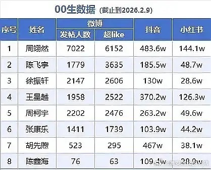 00生全平台数据来了:周翊然,陈飞宇,徐振轩,王星越,周柯宇,张康乐,胡先煦,陈鑫海