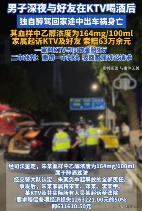 太离谱了!这算什么事?甘肃平凉,一男子醉酒后执意驾车回家,途中不幸遭遇车祸后离世,交警认定其全责,可家属却将一同喝酒的朋友和KTV告上法庭索赔63万,一审判决3人共同赔偿9万,3人不服上诉。最终二审法院驳回家属全部诉求! (本信息来源于:红星新闻) 朱某这人,平时看着挺正常一男的,谁知道那天晚上就犯浑。 酒桌上那阵势,是真没见过有人这么能劝的,但这次还真不是人家劝,是他自己要喝。 那天晚上KTV里灯红酒绿,音乐震得人心慌,朱某喝完一杯又一杯,那架势,不知道的还以为他是要去参加什么喝酒比赛似的。 几个人凑一块,本来图个乐呵,谁能想到最后闹出这事来。 最离谱的是朱某都醉成那样了,站都站不稳,还非要自己开车回家,旁边朋友拦都拦不住,这人是咋的了? 人家朋友已经做到位了,把他送到楼梯口,眼看着他上楼了,这还要怎么样? 难道还得跟着人家进屋给他脱鞋、把他扛到床上、再给他盖上被子不成?这要求也太离谱了吧! 车祸现场那个惨状,都不能细说,交警一来,直接就判定朱某全责,这还有啥好说的? 酒后驾车,这不是明摆着的事吗? 可朱某家属不这么想,他们觉得,既然是一起喝的酒,那你们就得负责。 这逻辑我也是服了,合着以后跟谁一起吃饭,对方出了啥事都得担责任?那谁还敢跟人一块吃饭喝酒? 一审判决下来,3个朋友和KTV一共赔了9万块钱。 这判决一出,那三个人能服吗?当然不服! 凭什么?我们又没逼他喝酒,又没把他塞进车里让他开车,怎么就成我的错了? 朱某都多大个人了,是个成年人吧?自己喝多少酒自己没数吗?自己能不能开车自己不知道吗?这锅凭什么让别人背? 二审,把事情的前因后果查了个底朝天。 朱某是这次酒局的攒局者,也就是说,是他主动组局请人家喝酒的,不是人家把他拽过去的。 酒桌上,没人劝他灌他,全是他自己一杯接一杯地往下灌,谁拦着跟谁急,这能怪谁? 朋友把他送到楼梯口,这已经够意思了。都是成年人了,人家把你送到地方了,还要怎样? 难道非得把他送进屋、看着他躺床上睡着才能走?这要求也太过了吧? 万一送进屋了,人家家属又说你未经允许闯入民宅怎么办?做人得讲道理不是? 朱某家属那63万的索赔要求,也是醉了,亲人走了是挺让人难受的,但这事赖不着别人。 朱某自己选择的酒后驾车,自己选择拿生命开玩笑,这后果当然得自己承担。 这家属就是想找个地方撒气、找人分担损失,可这不是明摆着欺负老实人吗? 最终,二审法院,驳回了朱某家属的全部诉求。 法律是保护守法公民的,不是用来讹人的工具,朱某的行为就是违法的,酒驾害人害己,这个代价太沉重了,但这个代价只能由他自己和他的家人来承担,不能转嫁给无辜的朋友和店家。 总有人觉得自己是弱势群体,就理应得到特殊照顾,出了事就得有人替他们担着。 这种思维,真是让人看不惯,每个人都要为自己的行为负责,成年人更是如此。 你喝多了要开车,出了事你就要自己扛,这有什么好说的? KTV也是倒霉,开个店容易吗? 人家做生意守法经营,又不卖假酒,又不强迫消费,客人自己喝多了出事了还要把人家告上法庭,这以后谁还敢做生意? 这世道要是都这样,那谁还敢跟人接触、跟人交往? 说实话,做人得有担当。自己做的事情自己负责,别总想着找个替罪羊。 朱某已经为他的行为付出了最惨痛的代价,他的家人应该反思的是为什么没能阻止他的违法行为,而不是到处找人索赔。 那三个朋友也是挺冤枉,本来好心好意陪朋友喝酒,人家醉了还送他一程,结果反被告上法庭。 这以后谁还敢讲朋友义气?谁还敢在朋友喝多了的时候帮把手?这判决要是维持一审那样,以后谁还敢跟人喝酒? 法律是公平的,但法律也不是万能的,更不是某些人用来达到目的的工具。 二审的判决,算是给那些想讹人的人提了个醒:别总想着自己弱就有理,违法就是违法,责任就是责任,没人替你背这个锅。 你说这事,要是让朱某自己选,他会怪朋友没拦住他吗? 笔者认为他应该不会,毕竟是个成年人,知道自己在干什么。倒是他的家人,这么一闹,反倒让朱某在九泉之下都不得安宁。 人走就走了,还得为了点钱把朋友告上法庭,这朋友做得也够呛。 朋友之间该尽的义务尽到了,剩下的就是成年人自己的选择了,选择错了,就要承担后果,这个道理谁都懂,就是有些人不愿意承认罢了。 对此,你怎么看呢?在评论区说说你的看法吧。