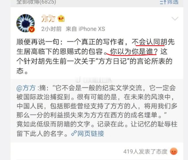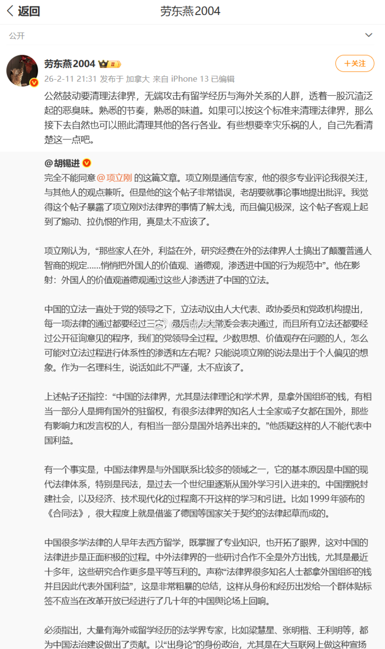 劳教授转发了胡锡进反对项立刚的微博,但我大胆断定,大概率老胡在劳眼里,仍然是个被鄙视的、不上席面的玩艺儿让我想起仿仿骂老胡,你以为你是谁(图7)另外,我一贯不认同网络上打嘴仗,因为文字来文字去,吵不出结果,而且很容易被误导、篡改他人的言论。例如图1,劳教授指责项立刚“公然鼓动要清理法律界”,可是项立刚明明对法律界加了很多限定语(图2),指的是“拿外国组织的钱,~~拥有国外的驻留权,~~全家或子女都在国外(图2)”这种中国法律人,劳教授指责时,直接把这些限定语去除,把人群范围扩大化,这完全符合一个不讲理的女老登就地打滚、抓散头发骂街的架势(图3起)