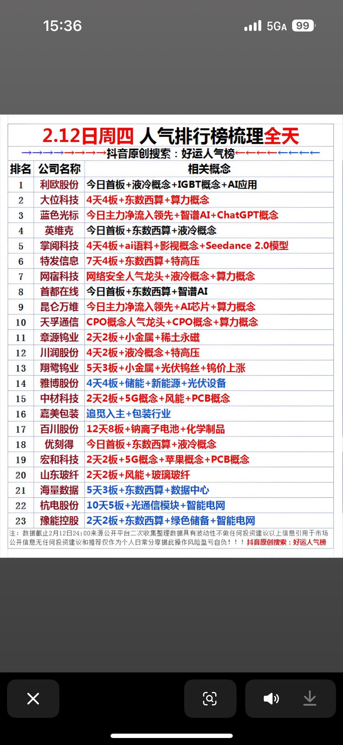 2月12日人气股聚焦AI、算力、液冷及新能源概念,多股连板活跃,市场热点轮动明显。