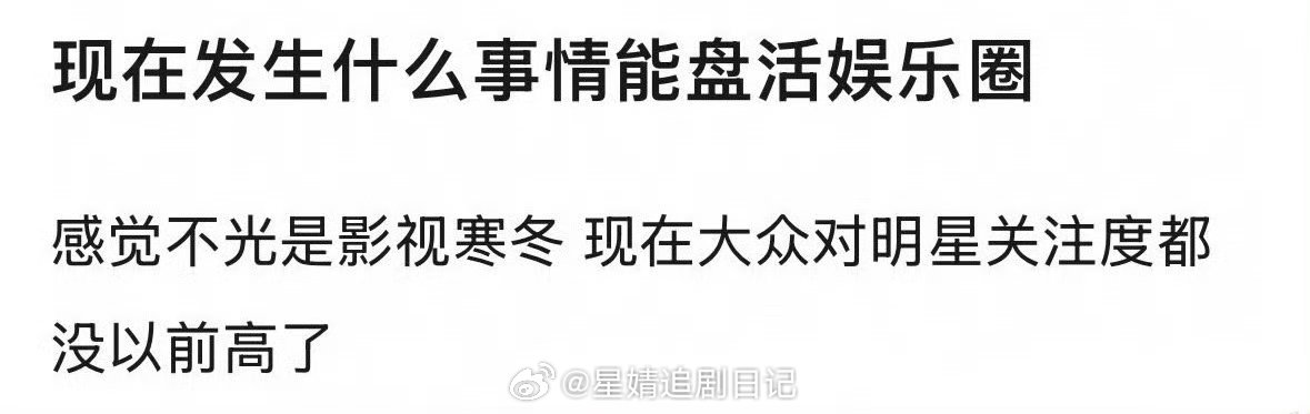 再来一次上春山吧。。去年我吃瓜贼快乐只要这群流量还在撕一堆同质化作品甚至于连编剧都找不出原著中心思想的古偶现偶,影视就盘不活;然后娱乐方面接着小瓜靠声明大瓜靠公关律师函当威胁函用,群众一看好吧反正劣迹声讨也没用自然连讨都不讨只有粉圈。这样咋活