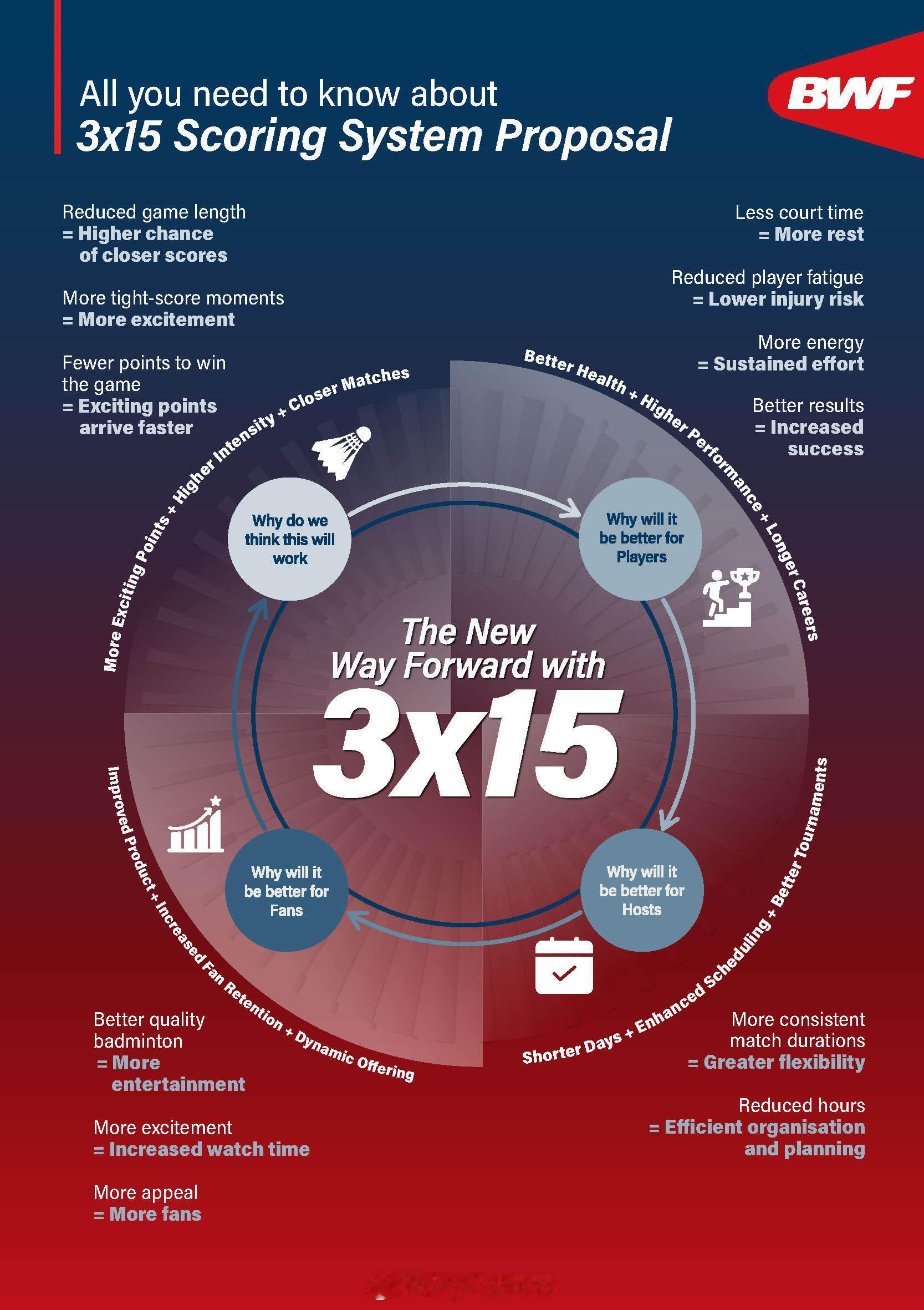 羽联超级赛 2月12日,世界羽联发文,通报理事会已经同意提议采用三局15分制,将在4月25日的世界羽联年会上有成员协会进行投票表决。