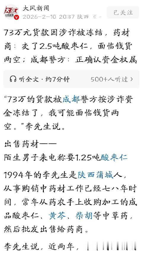 陕西渭南,男子从事中药材购销工作,有个大客户要购买2.5吨酸枣仁,他喜出望外,不仅交付了自己库存的1.25吨酸枣仁,还从朋友那里购买了1.31吨酸枣仁,一共收到73万货款。不料,第二天去收购药材时,他的账户竟然被外地警方冻结,货款也成了涉诈资金,面临钱货两空的境地。男子主动给警方说清他正常交易的事实,希望能解冻这边货款,谁知,警方的说法让他更加无语。 有这么个做中药材买卖的大哥,在这一行里摸爬滚打了七八年,一直都是规规矩矩地收货、卖货,在圈子里口碑那是相当不错。 前阵子,他碰上了一个“大客户”,一开口就要2.5吨酸枣仁,这数量可不小,而且对方付款特别痛快,大哥心里那个美啊,觉得这是笔好买卖。 这客户也是真爽快,先把73万货款给打了过来,大哥一看钱到账了,心里那块石头也就落了地。 他自己仓库里本来就有1.25吨货,不够的那部分,他又赶紧联系朋友,从朋友那儿调了1.31吨,把数量给凑齐了。 然后按约定的时间,把货全给人家发过去了。整个过程钱货两清,顺顺利利,大哥还想着以后能长期合作呢。 结果第二天,大哥像往常一样去市场上收药材,准备给人家转账付款的时候,银行那边突然提示账户异常,用不了了。 他赶紧一查,好家伙,银行卡被外地警察给冻结了!那笔刚收到的73万货款,竟然被认定成了涉嫌诈骗的资金。 大哥当时就懵了:我这是正经做生意啊,货可是实打实交出去了,钱也是人家主动转过来的,怎么就成赃款了呢?他越想越着急,赶紧联系冻结账户的警方,把事情从头到尾、一五一十地说了一遍,还把交易记录、发货凭证、聊天记录啥的都翻出来提交上去,就是为了证明自己啥都不知道,完全是正常做生意,收的这笔钱也是合情合理的。 他跟警察解释了半天,说自己没参与任何诈骗活动,也不清楚对方这钱有问题,可警察的回复让他更无奈了:这笔钱是从被骗群众那里转过来的,属于涉案资金,必须得先冻结起来。 得等把这笔钱的来龙去脉查清楚了,还得走完程序才能处理,现在肯定不能解冻。 大哥一听这话,彻底慌了神,货都已经全部交给对方拉走了,现在钱被冻在卡里取不出来,这就等于钱货两空啊! 他不光这笔生意赚不到钱,还得赔朋友调货的钱,还得还之前欠下的债,家里人一听这事,急得都住院了,这生意眼瞅着就要垮台了。 更让他头疼的是,这事还牵扯到跨省办案,他联系收货地的警察,人家说冻结单位在外地,他们管不了,他又找冻结资金的那边警察,人家说还在侦办案件、核实权属,让他等着,两边推来推去,他跑了一趟又一趟,连张正式的回执单都没拿到手。 大哥怎么也想不通:我自己守法经营、正常做买卖,凭啥要为别人的诈骗行为买单啊?货交了、钱收了,流程完全合法,到最后却要让我来承担全部损失。 这事传到网上以后,很多做生意的人都感同身受,大家都在说,现在的电信诈骗洗钱手段太隐蔽了,骗子拿着赃款来买货、消费,把正规商家卷进这趟浑水里,商家根本没法分辨这钱到底干不干净。 一旦收款后卡被冻了,往往面临的就是货拿不回来、钱取不出来的窘境,维权难、流程慢,损失全得自己扛着。 其实法律上有明确规定:善意取得诈骗财物的,不予追缴,像这位大哥这样,不知情、正常价格、正常交易、足额交货的情况,属于典型的善意第三方,理应受到法律保护。 可现实中呢,冻卡容易解冻难,异地协作效率又低,商家夹在中间真是哑巴吃黄连,有苦说不出。 现在大哥每天就是跑银行、找警察、找律师,精神压力大得不行,他只想要个公平的结果:要么解冻属于他的合法货款,要么帮他把货追回来。 可直到现在,事情还是没个准信,那73万依然被冻着,生意停摆了,家里也乱成了一锅粥。 这起真实事件给所有做生意的人提了个醒:大额交易一定要多留个心眼,核实对方身份、保留好完整的凭证,尽量走对公账户或者监管账户,降低收到赃款的风险。 同时也希望执法部门在打击诈骗、追回赃款的时候,能兼顾一下善意商家的合法权益,别让老实人为别人的错误付出这么惨痛的代价。 本来好好的一笔生意,最后变成了一场灾难,货没了,钱冻了,家里急了,生意悬了。 大哥现在唯一的指望就是事情能尽快查清楚,早点把钱解冻了,让他能活下去,把生意继续做下去。 对此你怎么看? 信源:大风新闻