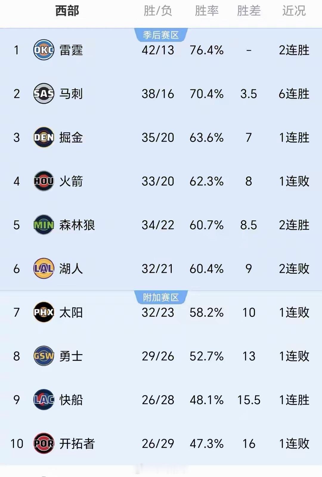 西部排名剧变,3队实现反超,湖人跌至第6,仅领先太阳1个胜场,季后赛席位压力陡增,西部卡位战愈演愈烈。