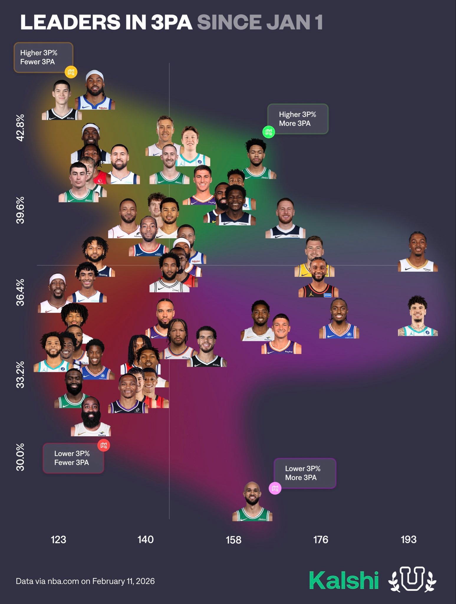 1月份至今三分球出手命中的分布图