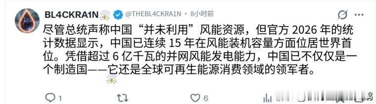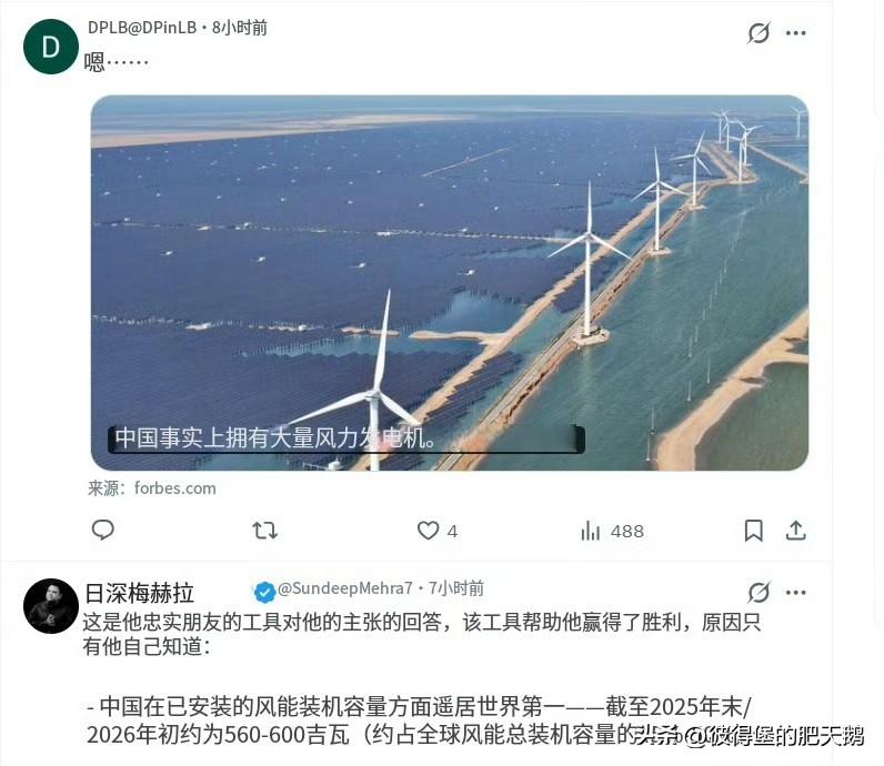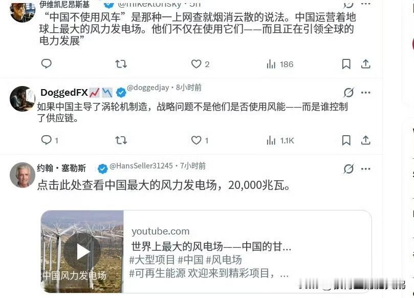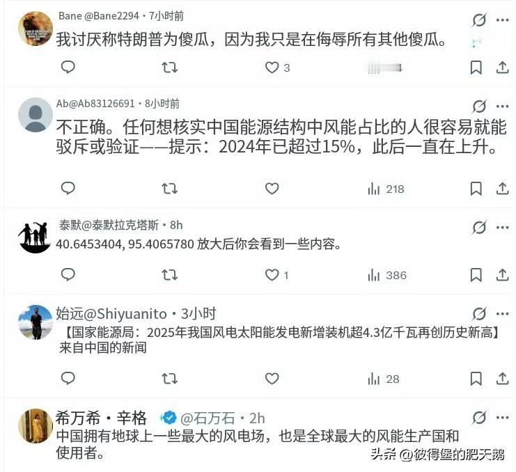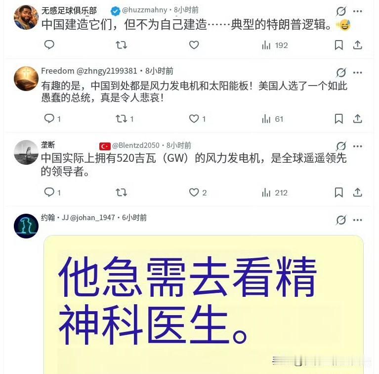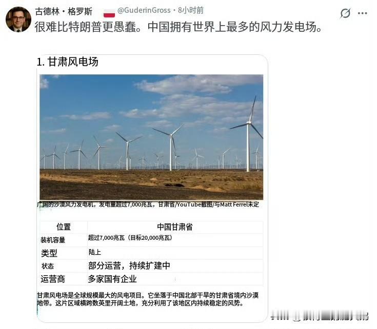 特朗普长再次指责中国制造“阴谋” 这是他第二次狂喷中国的风力发电领域。特朗普说:“那些疯狂的风车。它们是中国制造的。它们是中国制造的,却没有被中国使用。 我们来看看中国的几个风力发电场。看看你能不能找到一个”。 如此荒谬,光天白日下的撒谎,自有国外网友替咱们辩经(见图2至图9),并且是齐刷刷对特朗普的嘲笑。 不过话又说回来,中国风力发电也不是都靠谱,甘肃那边有一批工程师把风力发电厂的图纸看反了,给造成了井[狗头][狗头] #钟南山院士说会用证据让全世界服气# #中国人离登月又近了一步#