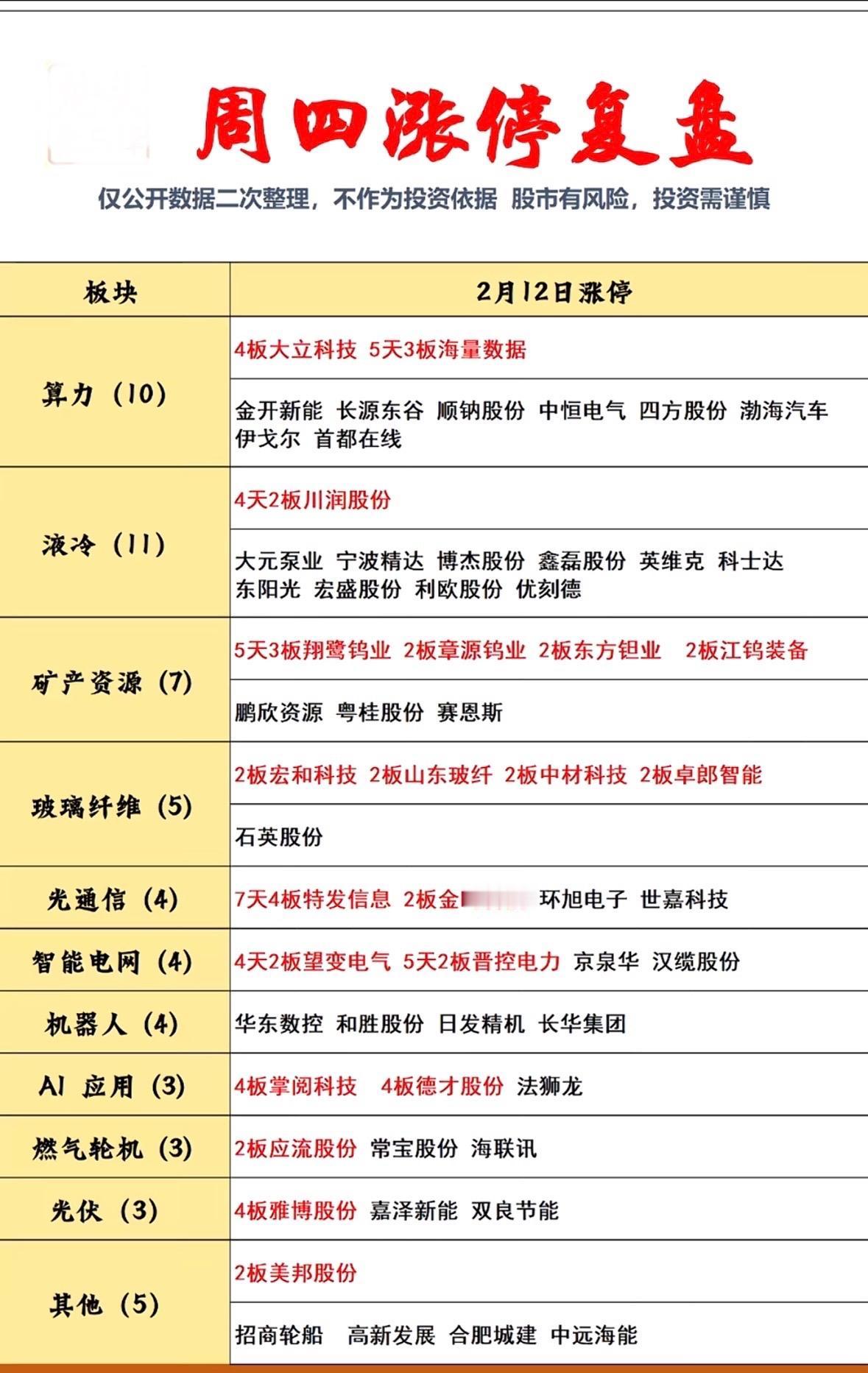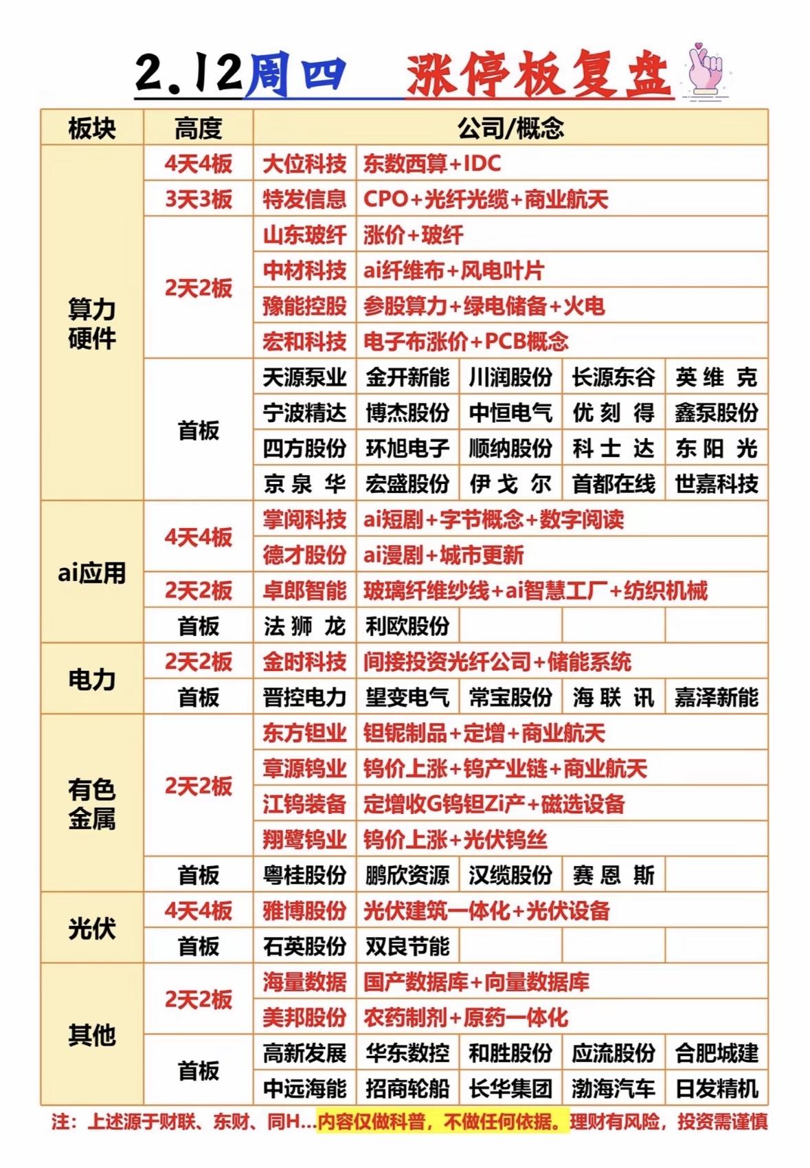 2.12涨停板复盘:板块分析与概念梳理 "东数西算领涨,AI应用与光伏活跃,钨价上涨带动有色板块,商业航天概念持续升温,投资需谨慎。"o