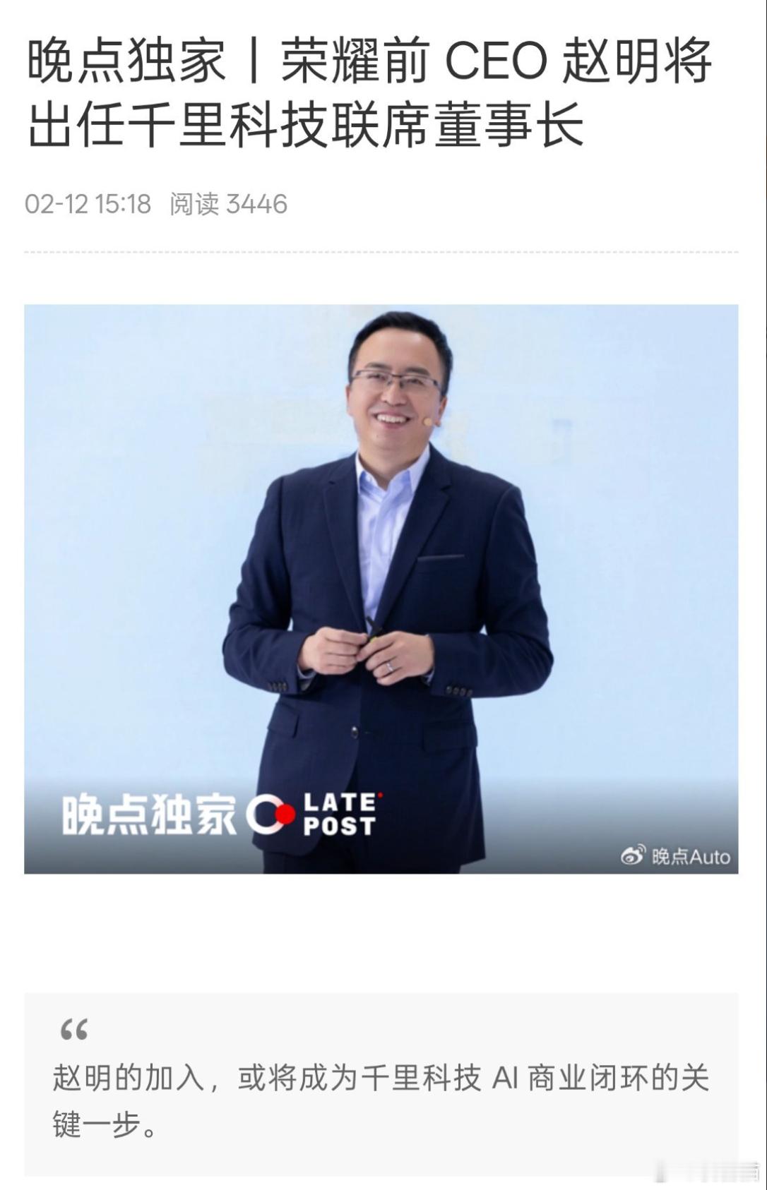 荣耀前CEO赵明将出任千里科技联席董事长,主攻AI商业化闭环。