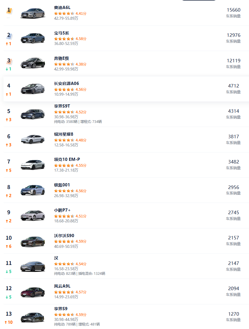 其中,问界M5和智界S7分别在中型SUV和中大型轿车中排名43和18,其他的在图里