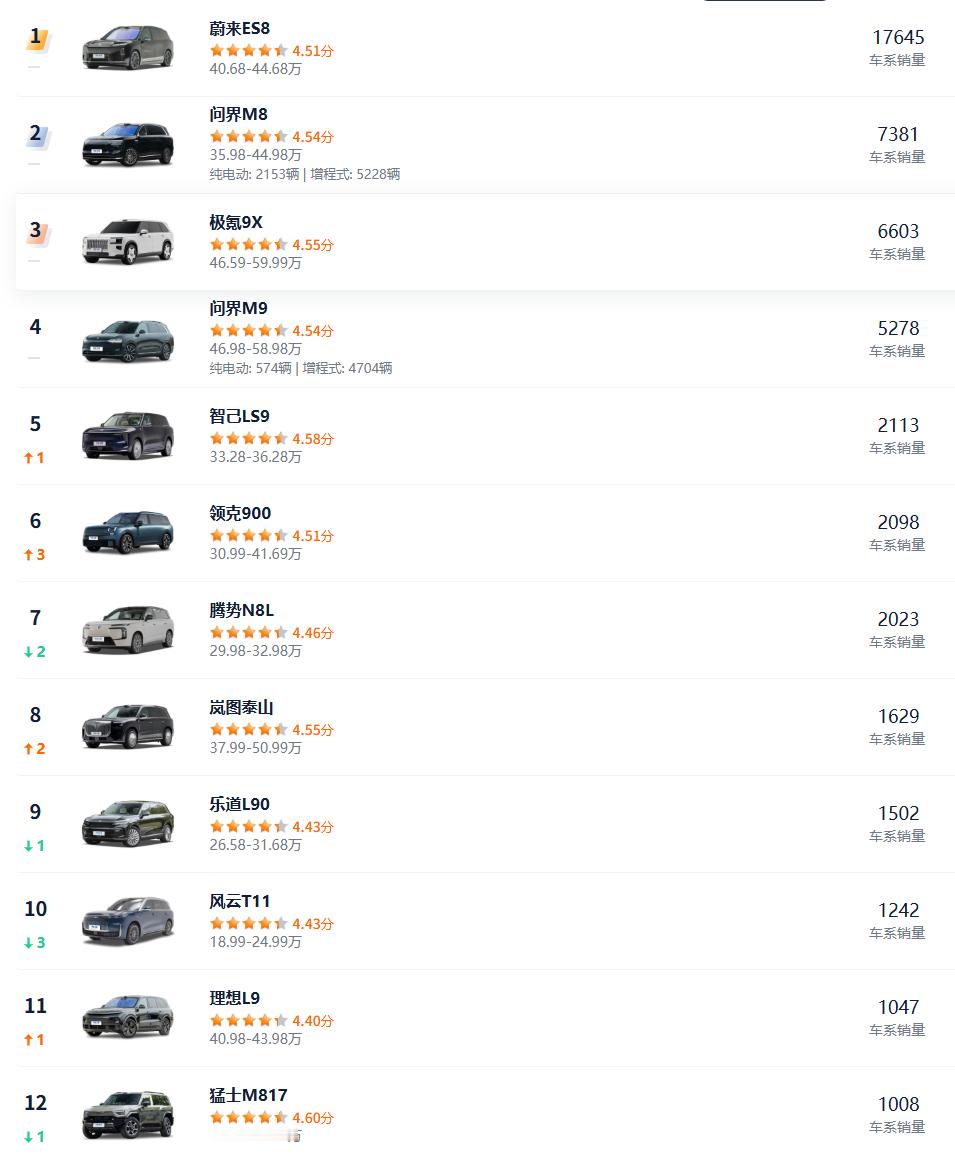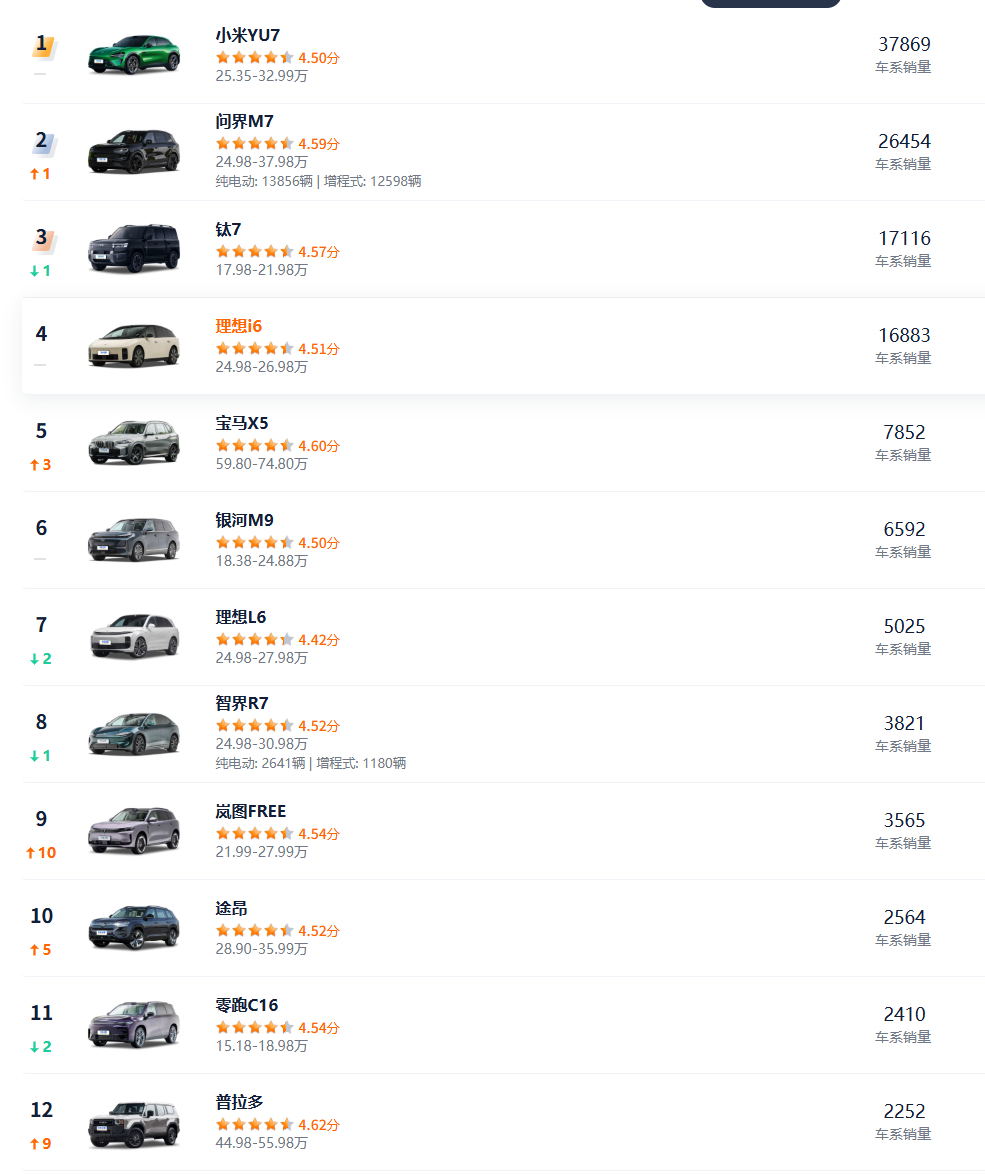问界M7表现依旧很好,在中大型SUV里排名第二,在全部车型里也能排名第四