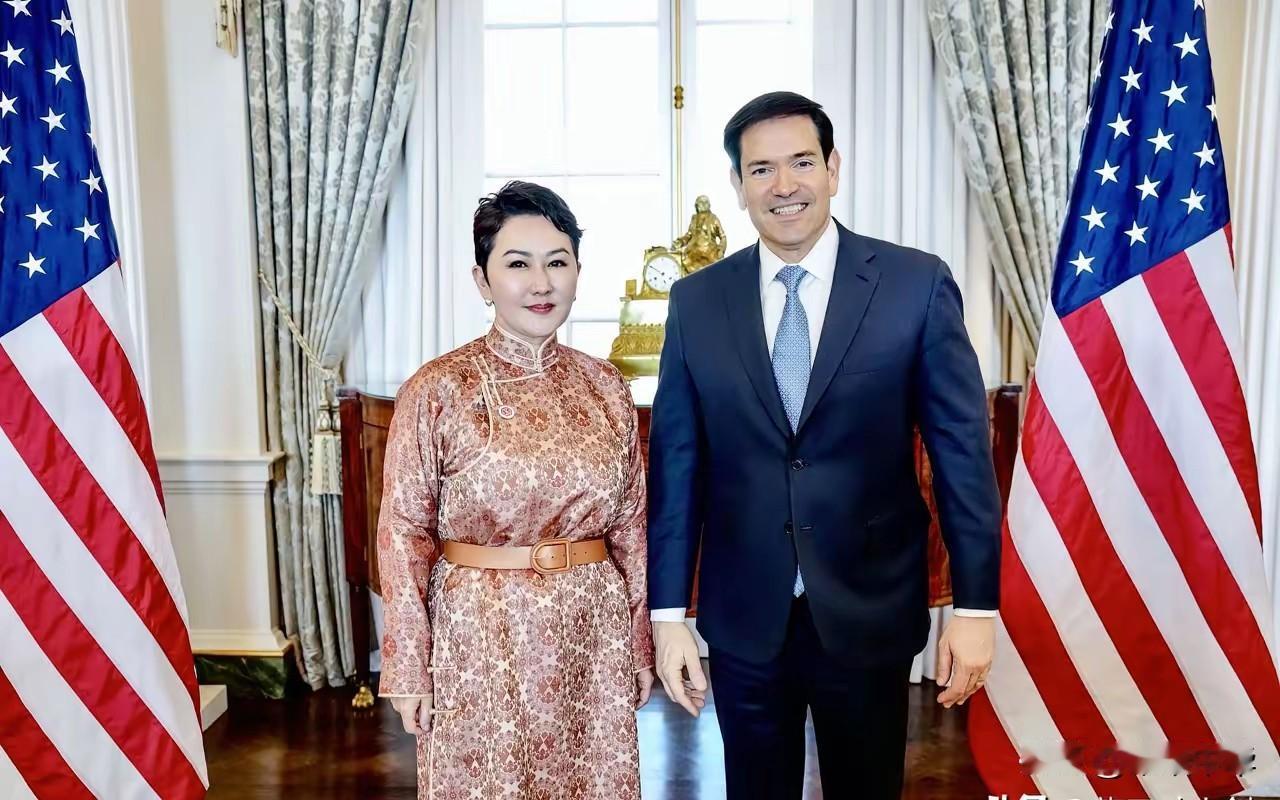 从两人背后的国旗设置而看,鲁比奥是东道主,蒙古女外长是客人,美国国务卿鲁比奥会见