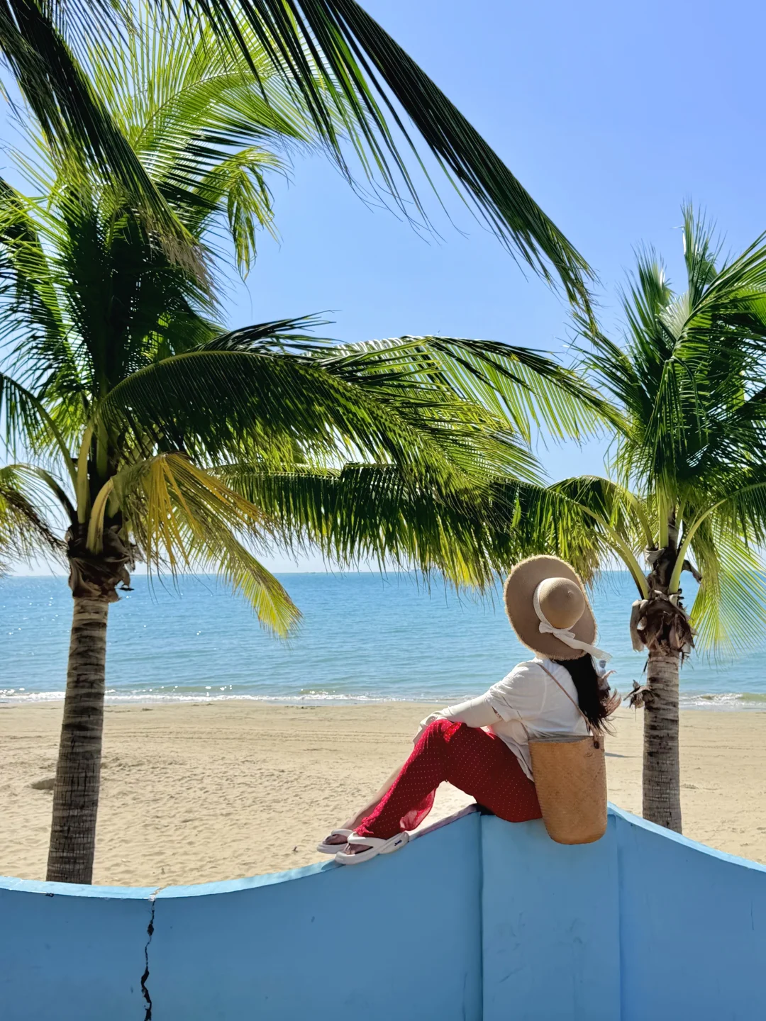 视野开阔无遮挡,桥上彩色字拍摄好看,还有蓝色围栏搭配椰林大海拍照绝了,这里看日落绝了