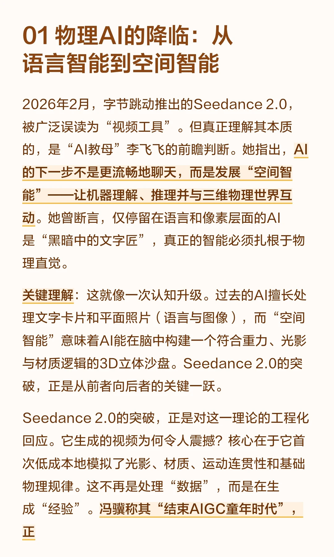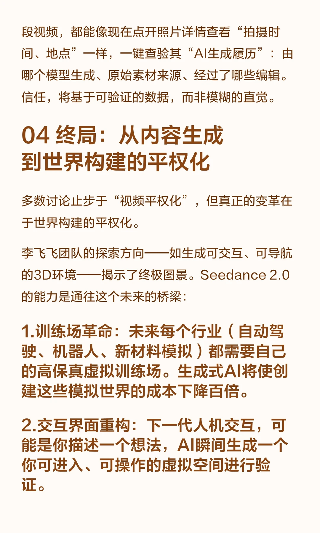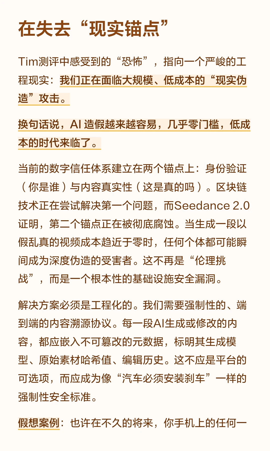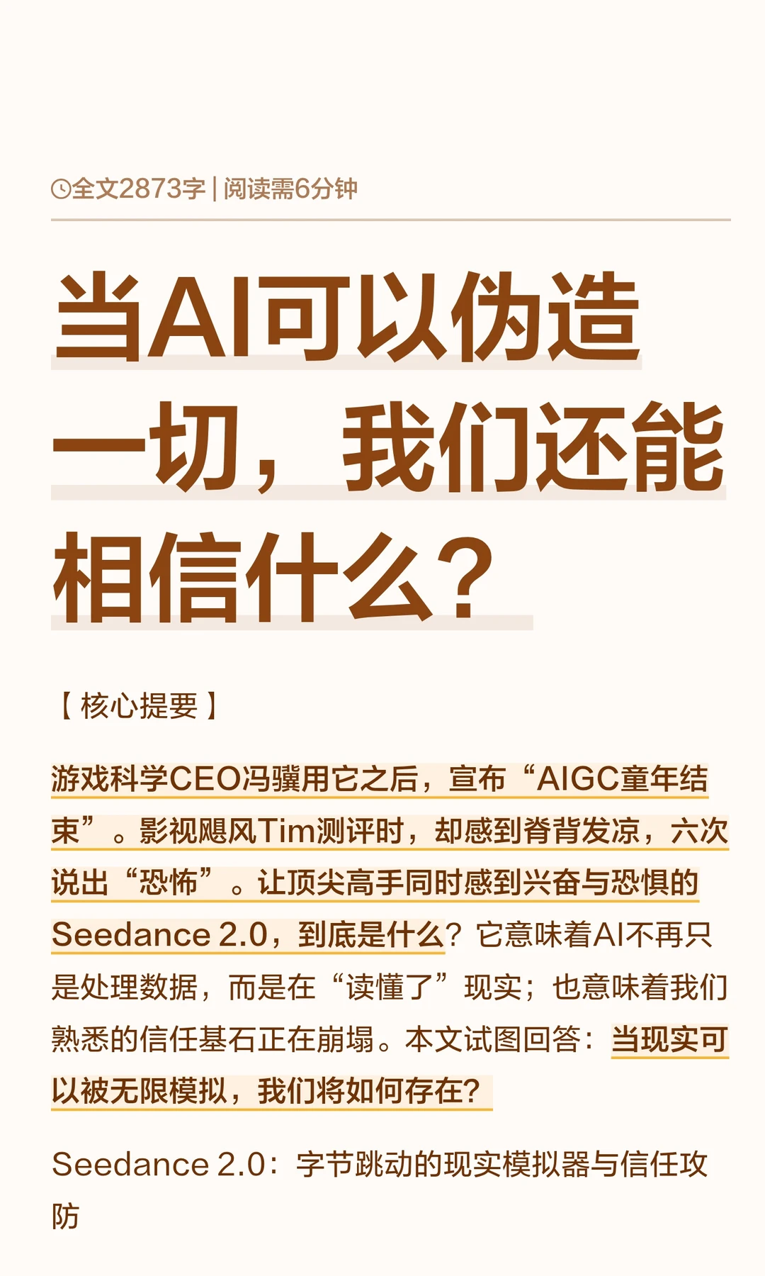 Seedance 2.0是字节跳动的AI工具,能模拟光影和物理规律,标志着AI从处理数据迈向模拟现实。 它引发对信任体系崩塌和人类角色变化的思考,推动社会重新定义信任与价值。 游戏科学CEO冯骥用它之后,宣布“AIGC童年结束”。影视飓风Tim测评时,却感到脊背发凉,六次说出“恐怖”。让顶尖高手同时感到兴奋与恐惧的Seedance 2.0,到底是什么?它意味着AI不再只是处理数据,而是在“读懂了”现实;也意味着我们熟悉的信任基石正在崩塌。 本文试图回答:当现实可以被无限模拟,我们将如何存在?