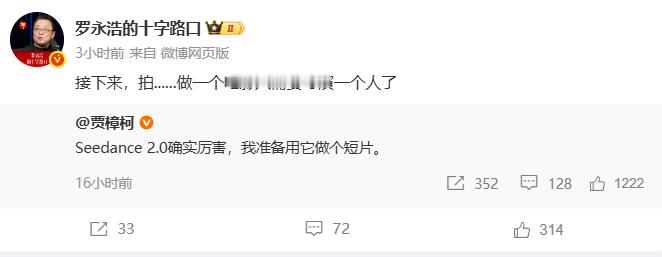 【罗永浩评价Seedance2.0】转发评价Seedance 2.0的内容称:“接下来,拍......做一个电影只需要导演一个人了。”