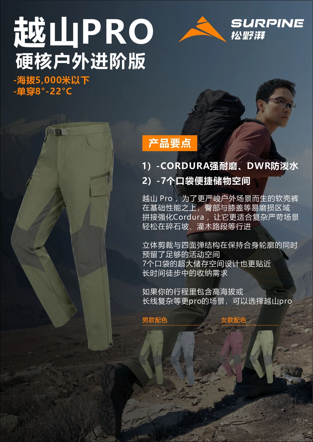 在基础软壳性能之上,臀部与膝盖的 Cordura 强化拼接[赞R],让它更适合碎石坡、灌木路段和长时间负重行进。[火R]立体剪裁与四面弹结构在保持合身轮廓的同时,预留了足够的活动空间,[火R]多口袋设计也更贴近实际行进中的收纳需求。如果你的行程里包含更高海拔或更复杂地形,可以选择越山体系中更pro的一条
