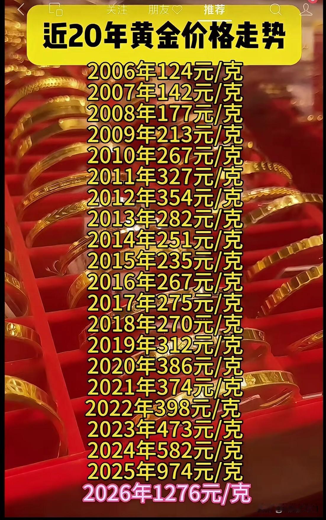 家人们谁懂啊!翻到这张近20年黄金价格表,直接惊掉下巴! 2006年才124元/克,我妈当年要是狠狠囤个几斤,现在直接原地财富自由了吧?😭 一路看下来,2011年冲到327,中间还跌过一阵,我那时候还跟我妈说“黄金不行了”,现在看简直是反向预言家。 2020年之后一路狂飙,2023年473,2024年582,到2025年直接干到974,2026年更是离谱到1276元/克! 当年嫌贵没下手的,现在拍断大腿;当年咬牙买了金镯子的,现在看那镯子都在发光啊! 早知道黄金这么香,谁还去买奶茶买盲盒啊! 现在再看自己那点小金饰,突然觉得每克都在替我争气。 所以说,有些东西看似是首饰,其实是时光给的底气。 你们家有没有当年压箱底的老黄金?快翻出来算算现在值多少钱!