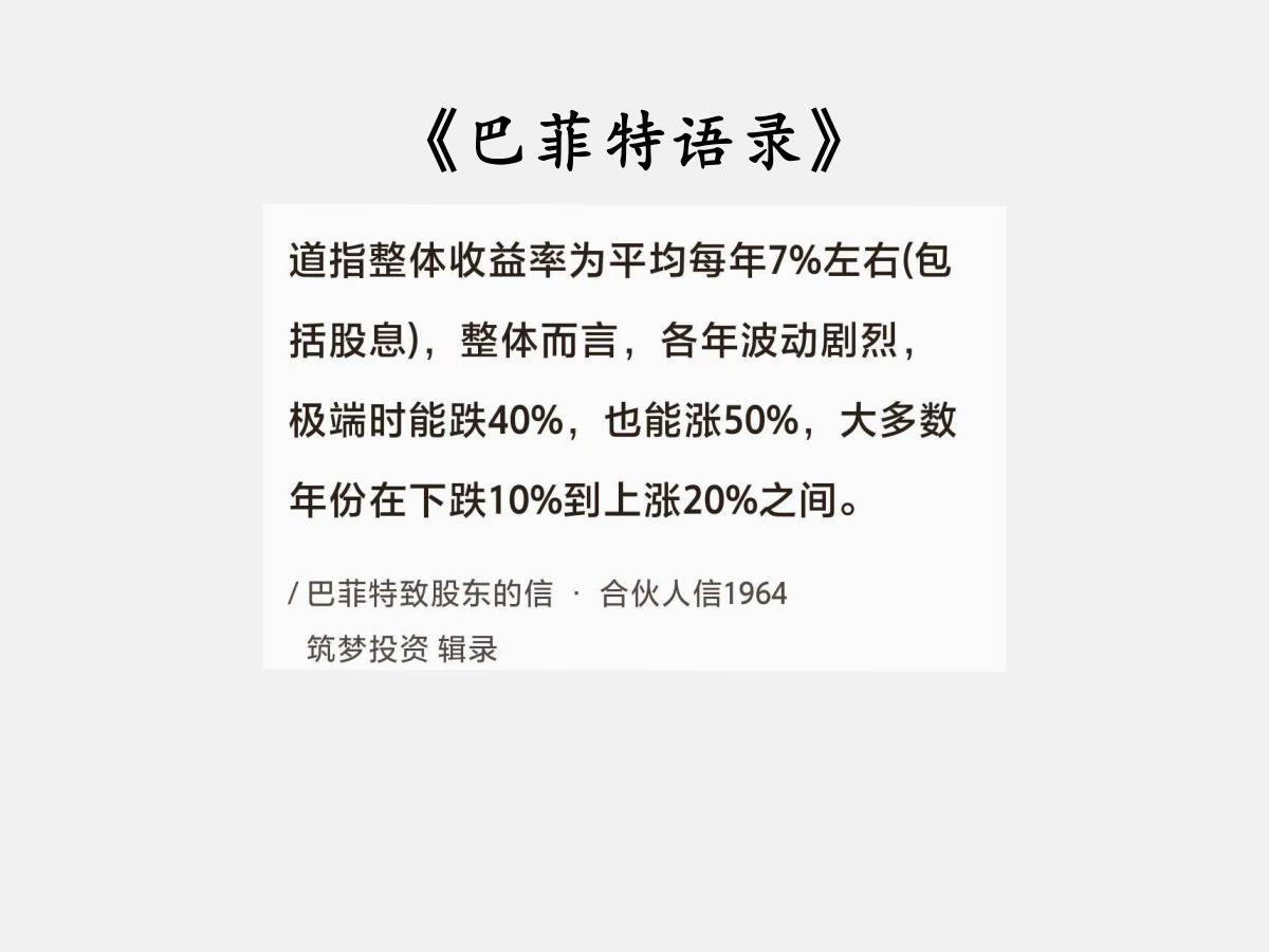 No.169 股神巴菲特谈“股市涨跌幅” 巴菲特曰:“道指整体收益率为平均每年7%左右(包括股息),整体而言,各年波动剧烈,极端时能跌40%,也能涨50%,大多数年份在下跌10%到上涨20%之间。” 关于股市涨跌,中国A股的老股民对此深有体会。年轻的A股有过两次轰轰烈烈的大牛市,随之而来的就是惨不忍睹的大熊市。 第一次大牛市发生在2006年到2007年。 当时,上证指数开盘于2007年的1164点,收盘于2008年的5262点,翻了4.5倍。最高时飙涨到了6124点,翻了5.3倍,何其疯狂! 然而,熊市总是跟在牛屁股后面。2008年,千股跌停的惨绝,想卖都卖不出去的绝望弥漫了整个A股。 当年,上证指数开盘于5265点,收盘于1821点。短短一年,跌幅高达65%,不得不再次令人感叹“股市何其疯狂”。 第二次大牛市开始于2014年的2112点,最高收盘于2015年的5178点,翻了2.5倍。 接下来的大熊市,最低时下挫到2016年的2638点,跌幅51%,再一次让股民见证到了股市的疯魔。 所以,你的投资组合承受得住50%的暴涨暴跌吗?心态上又是否能做到涨跌无心呢?做不到,是否投资股市就得慎重了。