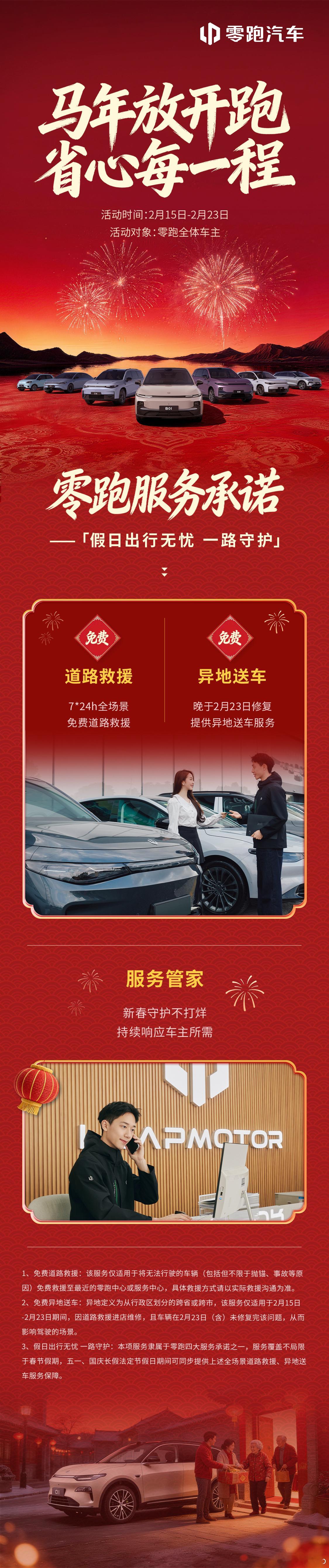 【零跑汽车】 1.救援服务: 7×24小时免费全场景道路救援2.异地保障: 若车辆维修完工时间晚于2月23日,提供免费异地送车服务