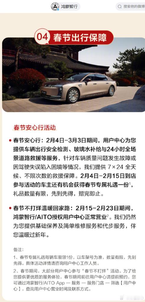 【鸿蒙智行】 1.春节安心行 :提供车辆出行安全检测、玻璃水补给。7×24小时全场景道路救援(针对质量问题或驾驶失误陷入困境,不限次数)2.春节不打烊:授权用户中心正常营业,提供基础保养、简单维修及代步服务