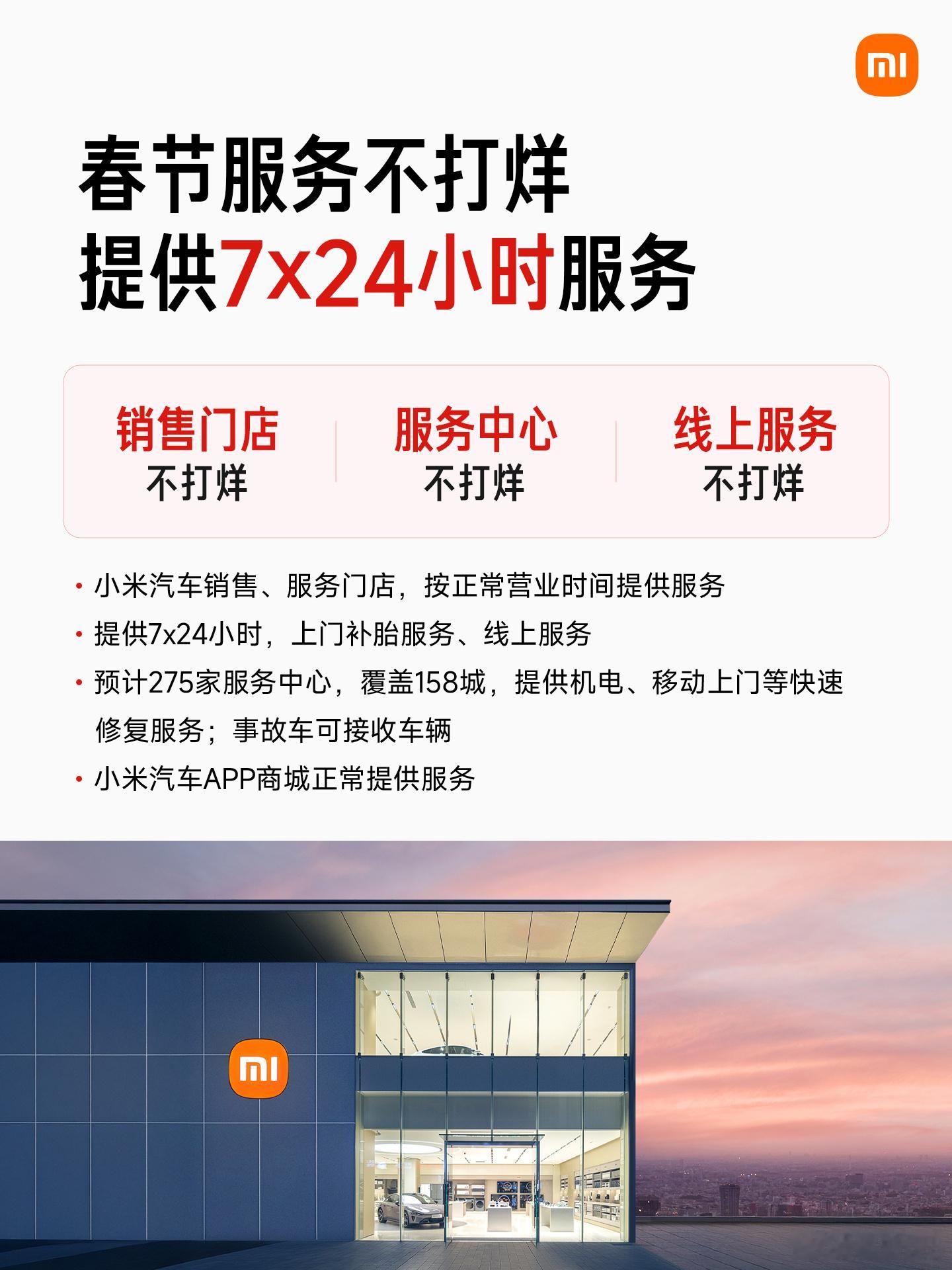 【小米汽车】1.门店运营: 销售与服务门店正常营业,提供7×24小时服务;预计275家服务中心覆盖158城,支持机电维修、移动上门快速修复及事故车接收2.费用报销: 因车辆自身故障导致抛锚,报销最高1500元交通费(高铁/机票)及最高500元住宿费3.免费救援: 因任何原因抛锚或事故,提供免费道路救援(不限方式/次数/里程)。同时赠送500元高德打车券(7日有效)。若晚于2月23日完成修复,可免费送车至指定城市