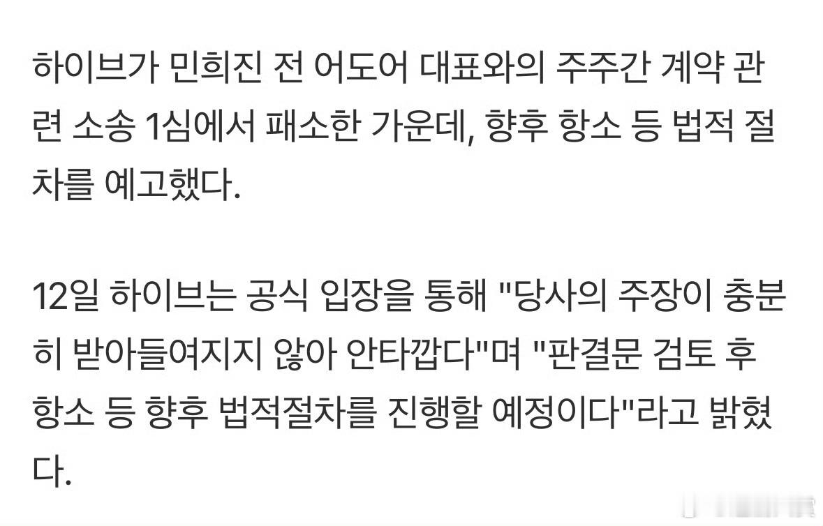 HYBE回应败诉HYBE回应败诉,表示:“对我方主张未能充分被采纳感到遗憾”,并称“在审阅判决书后,将推进包括上诉在内的后续法律程序。”