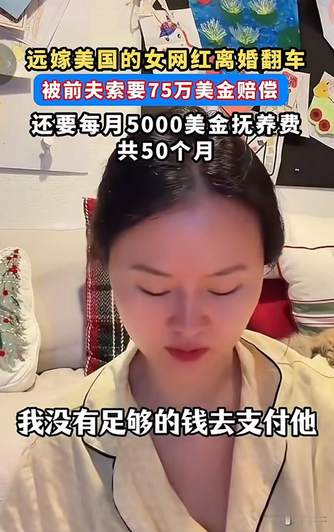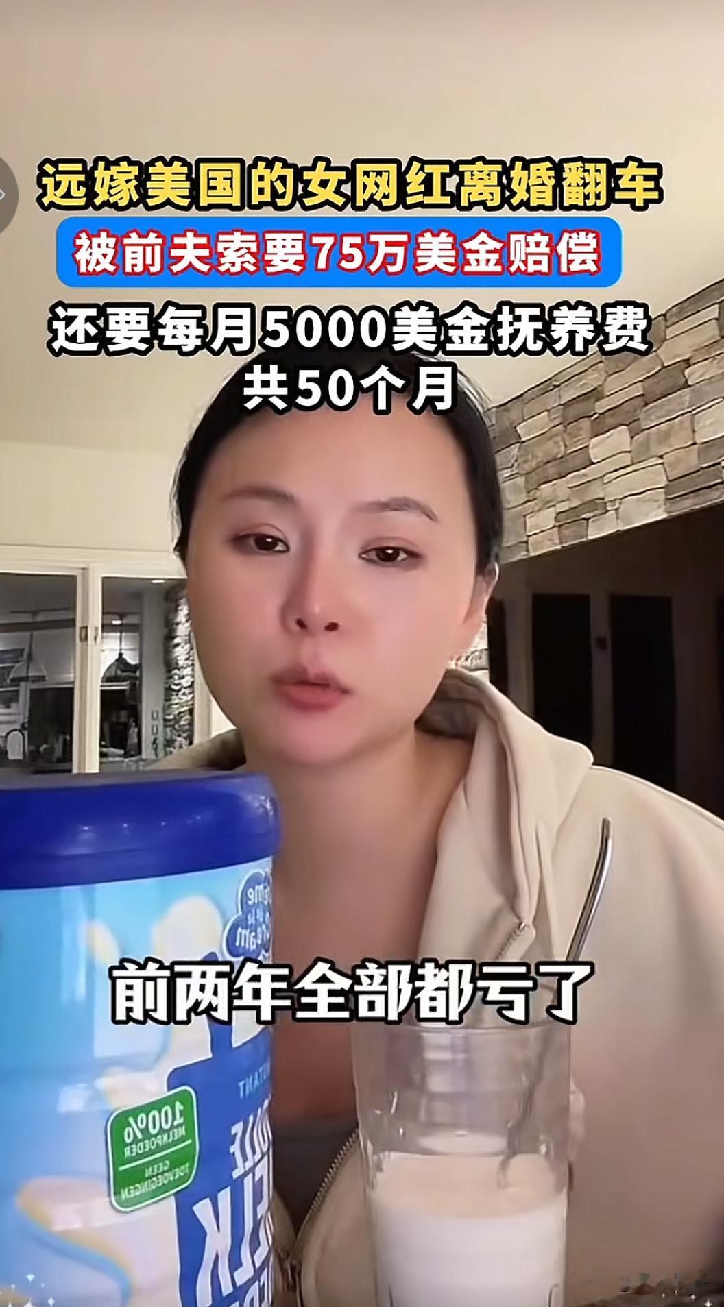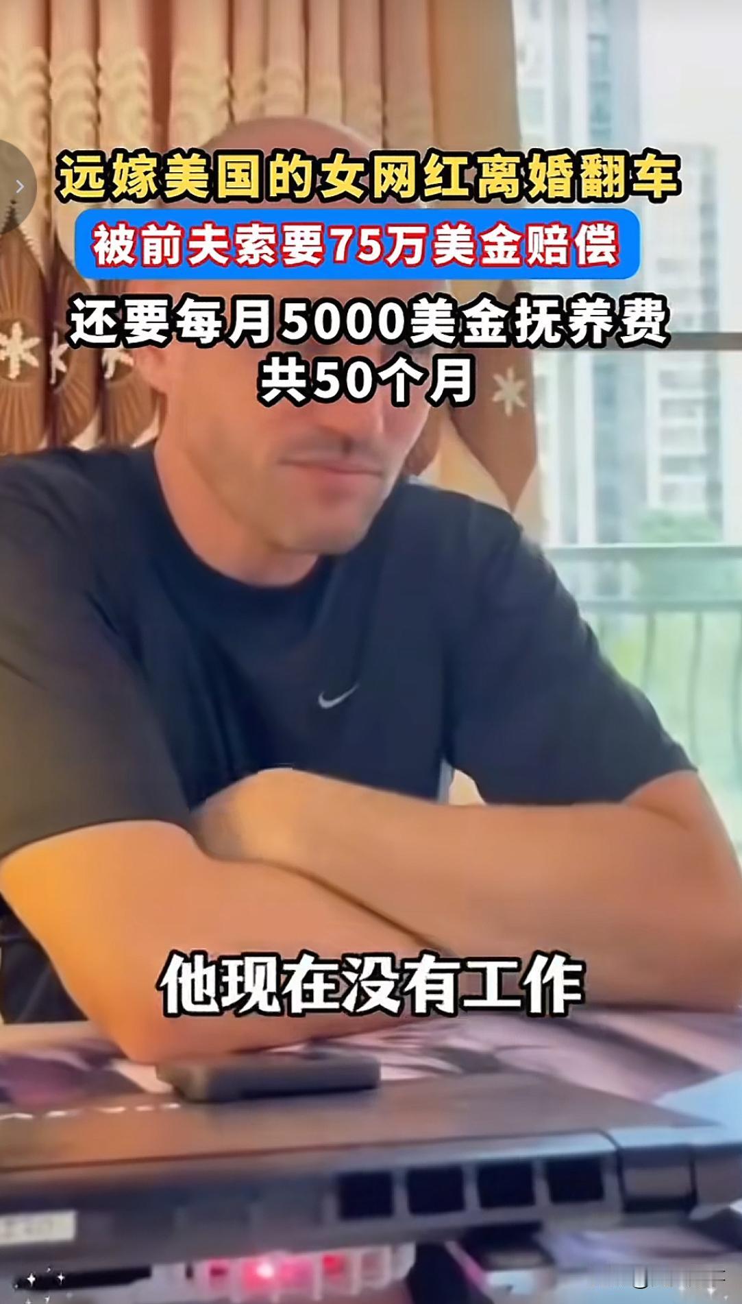 一个长期拍跨国婚姻日常、嗮在美“幸福”生活的女网红翻车了。其最近发的作品,不再是嗮幸福甜蜜、生活安稳、老公体贴,而是控诉那个老白男酗酒、家B、对家庭不负责任,并爆出日常生活中都是她赚钱养家,连日常开支的杂费都需要她来支出。现在提出离婚,那个老白男不但提出70万美刀的补偿,还要求支付50个月、每月5000美刀的“抚养费”!没错,老白男因为没有工作,所以向她这个女的索要抚养费!而且看样子她还必须给。这真的是颠覆三观之后的再颠覆!在结婚的时候啥都没有不说,在婚后倒贴,在离婚时要支付高额赔偿…这种情况在现在的外嫁女中并不少见,她们为了维持自己的体面、让人以为自己嫁了白男之后有高质量的生活,不但编造谎言来秀自己的“幸福”。然而这背后是巨大的生存压力和被暴力对待的现实!房子自己花钱买,贷款自己还,孩子自己带,还要拿钱给老白男外出吃喝玩乐,稍有不满就是一顿拳头!但是为了自己的面子、自己的人设,为了自己的孩子,默默忍受了,但随着收入下降,这种虚假的体面想维持也维持不住了:家庭的巨大开支和白男不断的索取,终于压垮了她,决定长痛不如短痛,来一个了断。却没想到,对方还要趁这个机会捞一票大的!再想想前些天看到的一个新闻:一男子再某红书假冒白男发了几个作品,就收到不少的女人私信。不禁感到可笑又可悲!只能说她们的认知,配得上她们的苦难!