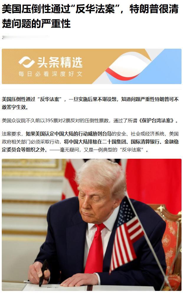 美国众议院以压倒性票数通过反华法案,特朗普很清楚问题的严重性,说白了就是又在玩 “以台制华” 的老套路,还叫嚣着要把中国踢出国际金融体系,简直狂妄又可笑。 现在国人真的不那么care了,都知道这就是美国的政治表演,实操性极低。 中国现在是全球第二大经济体,140 多个国家的最大贸易伙伴,欧盟、东盟这些国家不可能跟着美国瞎起哄。而且我们有自己的人民币跨境支付系统,也有反制手段,根本不怕它的所谓 “金融孤立”。 有人说,这跟140年前的排华法案如出一辙,都是种族歧视和霸权主义的体现;也有人觉得,美国就是急眼了,怕中国发展太快,只能靠耍无赖施压。