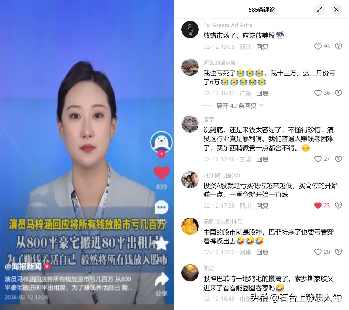 马梓涵股市亏数百万,豪宅变出租屋 非一线演员马梓涵,早年演艺高峰期攒钱买了800平豪宅,退圈后没稳定收入,把全部身家砸进股市亏了数百万,只能搬去80平出租屋,还说所有事都会过去。 别再说她来钱太容易不珍惜了!她不算顶流,红就那两三年,赚的是阶段性快钱,退圈等于断了所有收入。习惯了高消费,积蓄看似多,抗风险能力比普通人还弱,你见过哪个正常人敢把全部身家全仓股市的? 这事儿本质是双重反噬: 一是娱乐圈的收入结构bug,艺人赚快钱赚麻了,压根没建立风控意识,财商完全配不上手里的本金; 二是股市的小白收割逻辑,专坑那些盲目自信、没专业知识的人,买低位越套越深,买高位一重仓就跌,这不就是精准下套? 赚快钱的人,最容易栽在赚更快的钱上。别光仇富,普通人没那本金可亏,但这种财商缺失的坑,谁碰谁遭殃!