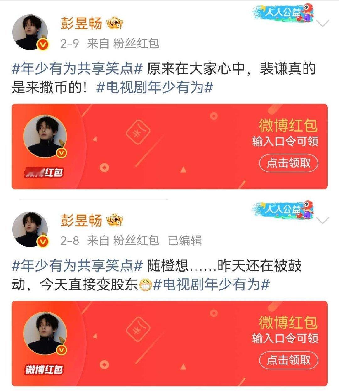 彭昱畅剧宣连发13天万元红包 彭昱畅新剧《年少有为》从开播到大结局点映礼,剧宣连发13天万元红包!沾沾裴总的财气