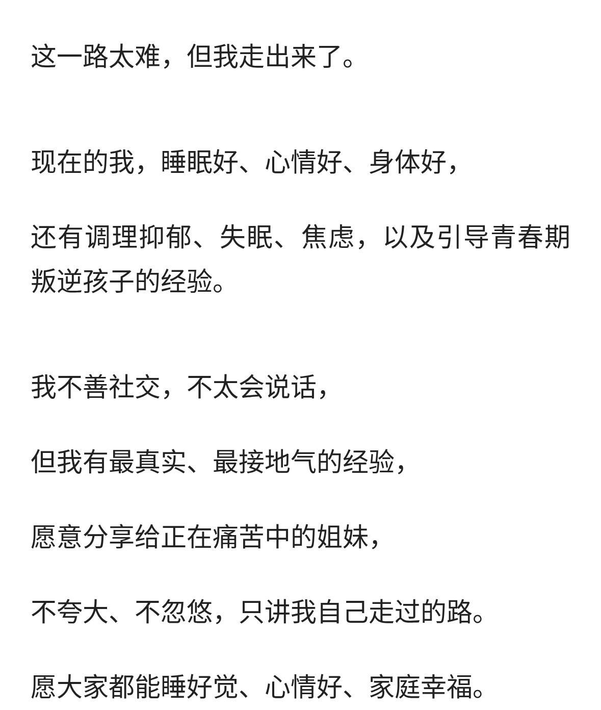 我今年54岁,想把我这半辈子的真实经历讲给大家听。 曾经被失眠、焦虑、抑郁症
