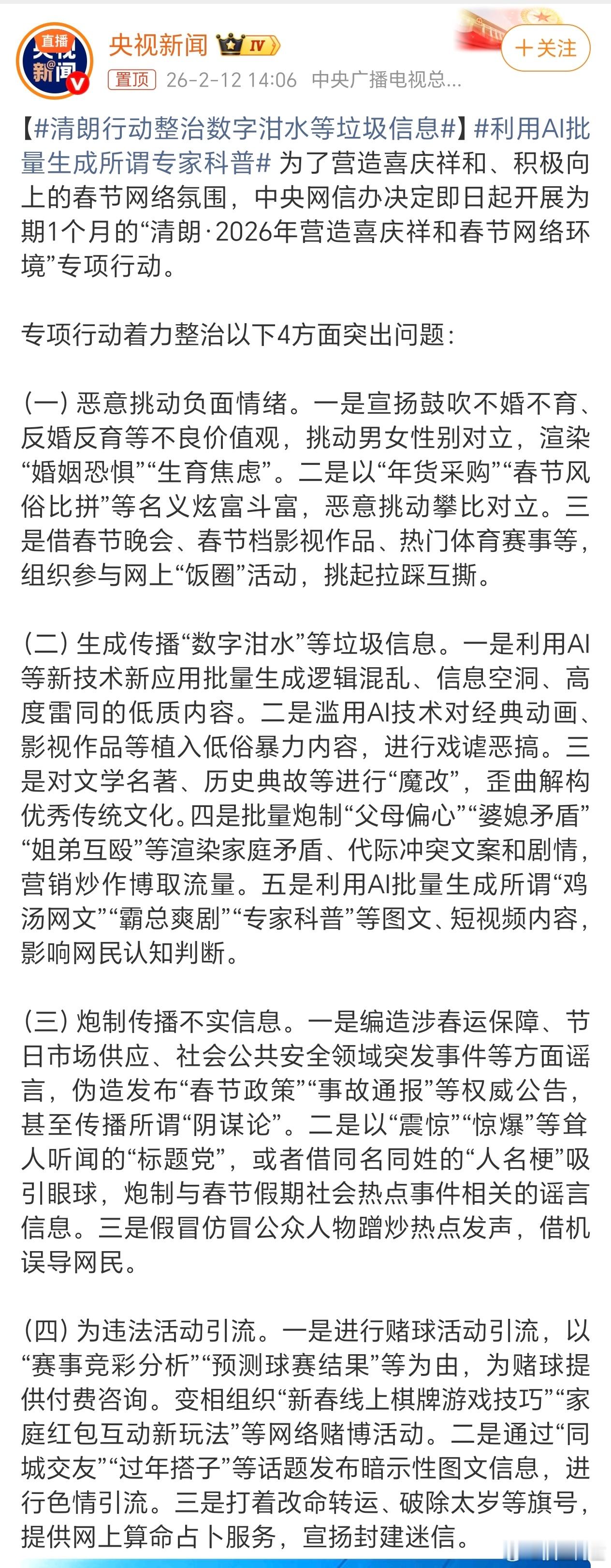 今年的清朗行动也开始了清朗行动整治数字泔水等垃圾信息