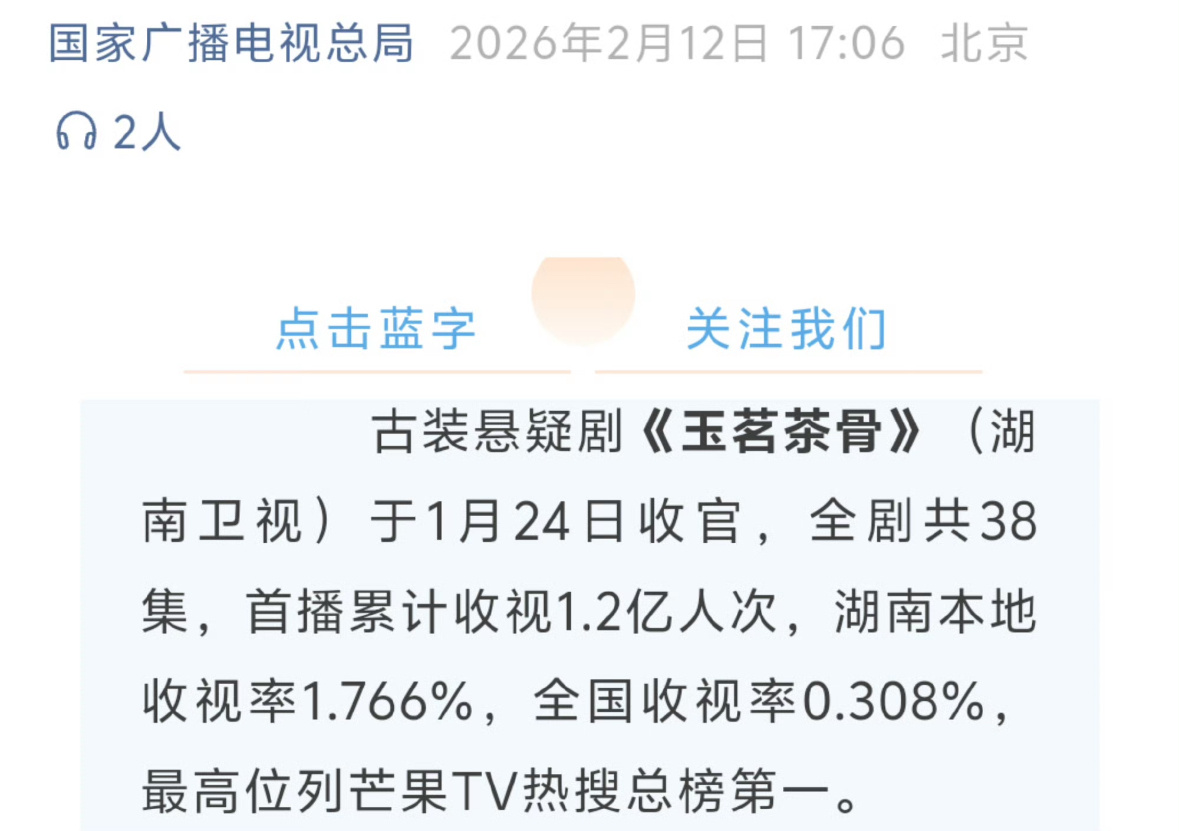 侯明昊扛剧生力实至名归❗️国家广电总局官方认证《玉茗茶骨》收视表现亮眼,首播累计收视1.2亿人次,湖南本地收视率1.766%,全国收视率0.308%。最高位列芒果TV热搜总榜第一☝🏻