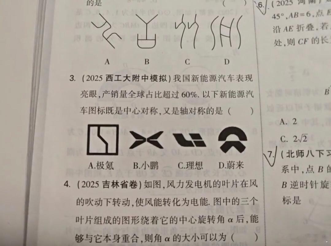 这是现在的中考真题,国产新势力的车标都上了,问了身边几个人都选的不一样,谁知道哪