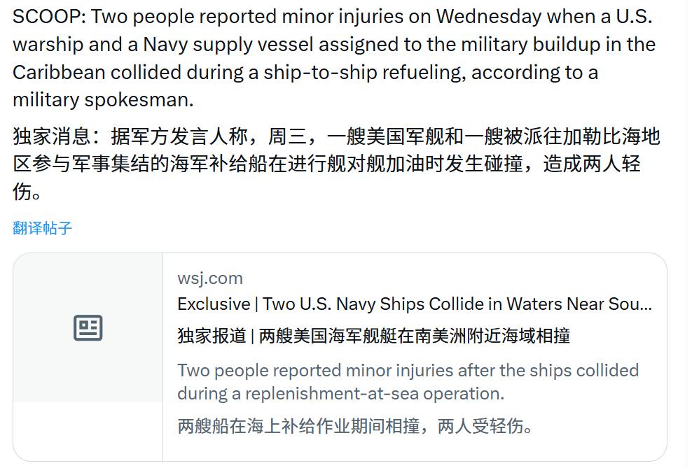 比印度水平还差,美国海军又撞船了,这次是驱逐舰和补给船玩碰碰船。 2月11日加勒比海区域,美国海军阿利·伯克级驱逐舰“特鲁克斯顿”号,和“供应”号快速战斗支援舰,在进行海上补给操作时发生撞击。这次运气比较好,只造成2人受伤没有死亡,船只也还能正常航行。虽然事故原因不明,但参考美军航母摘商船,F-35舰载机坠海等事故不断发生。只能说明美军舰机装备严重老化,再加上美军训练水平下降,不出意外都奇怪,坠机率已经超过印度,接下来撞船估计也是世界第一。